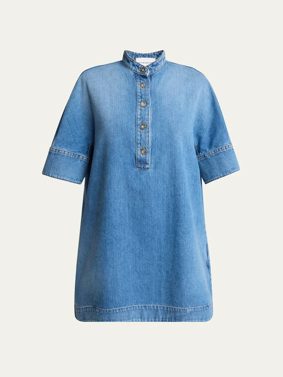 Givenchy dress in faded medium wash denim Band collar; five-button front Short sleeves; button cuffs A-line shift silhouette Mini length Slipover style Cotton Made in Romania Online Inquiries: BGS21_BA3FN| Store Inquiries: #5024762