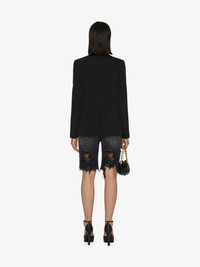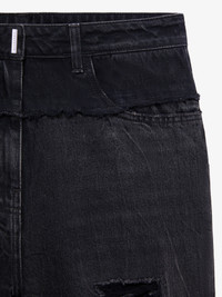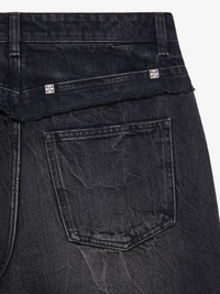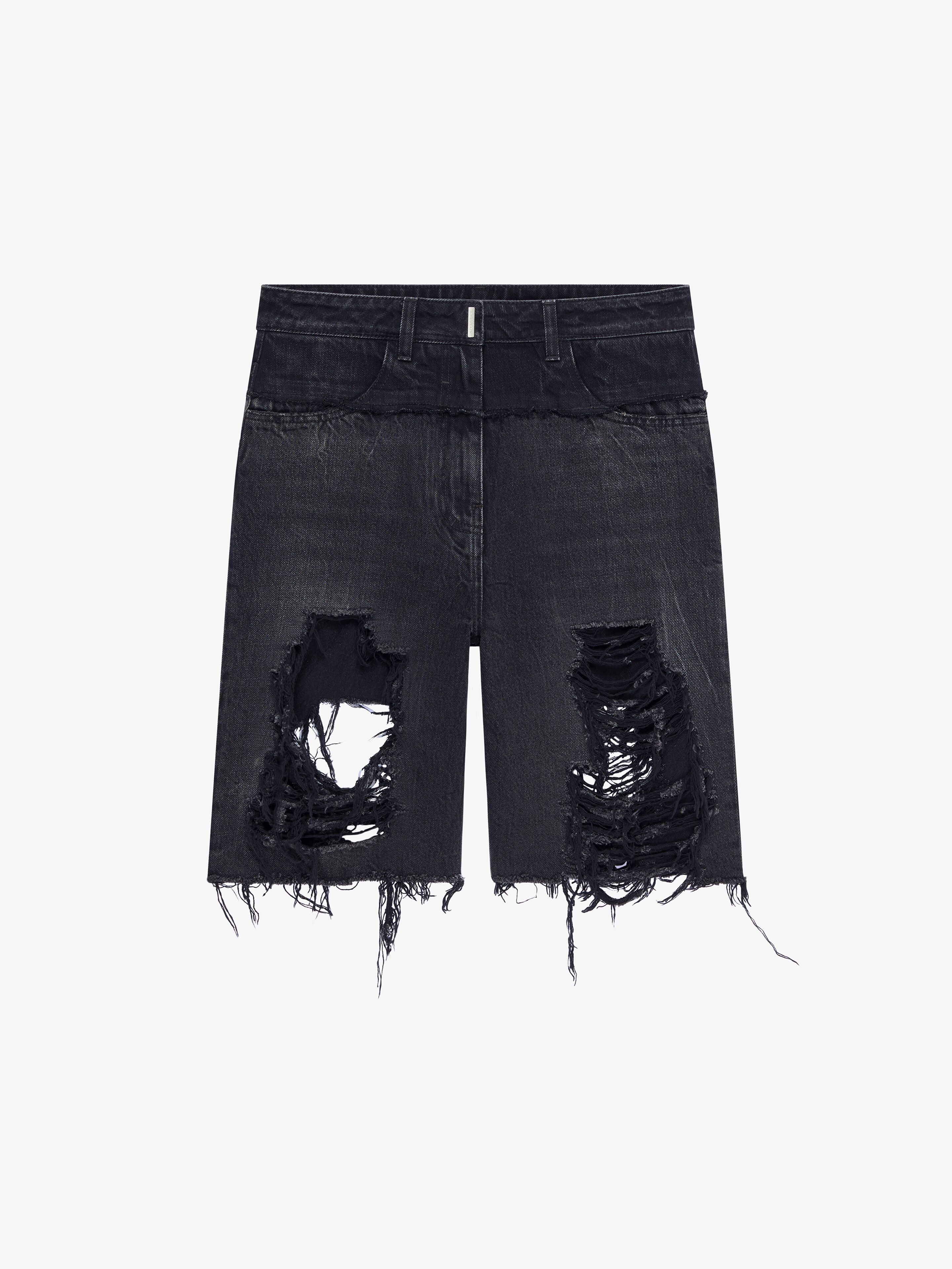 - Short in mixed denim and ripped. - Dark denim waist yoke. - Waist with loops with metal bar closure GIVENCHY. - Two side pockets on the front. - Two patch pockets on the back. - Metal rivets 4G. - Torn from the top of the thighs to the knees.