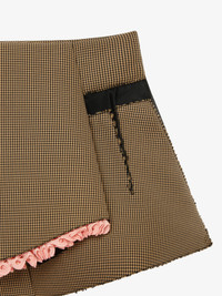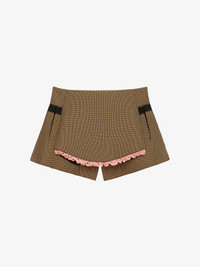 - Shorts in houndstooth motif technical fiber. - Color: brown. - Tailored fit reinforced with neoprene. - Raised apron-style overlaid inset on the front, trimmed with contrasting light pink broderie anglaise. - Wide raised pleats on the back. - Shiny black nylon insets around the waist and on the sides. - Laser-cut raw-edged cut-outs. - Zipper closure on the back.