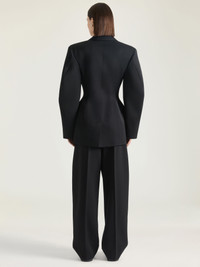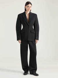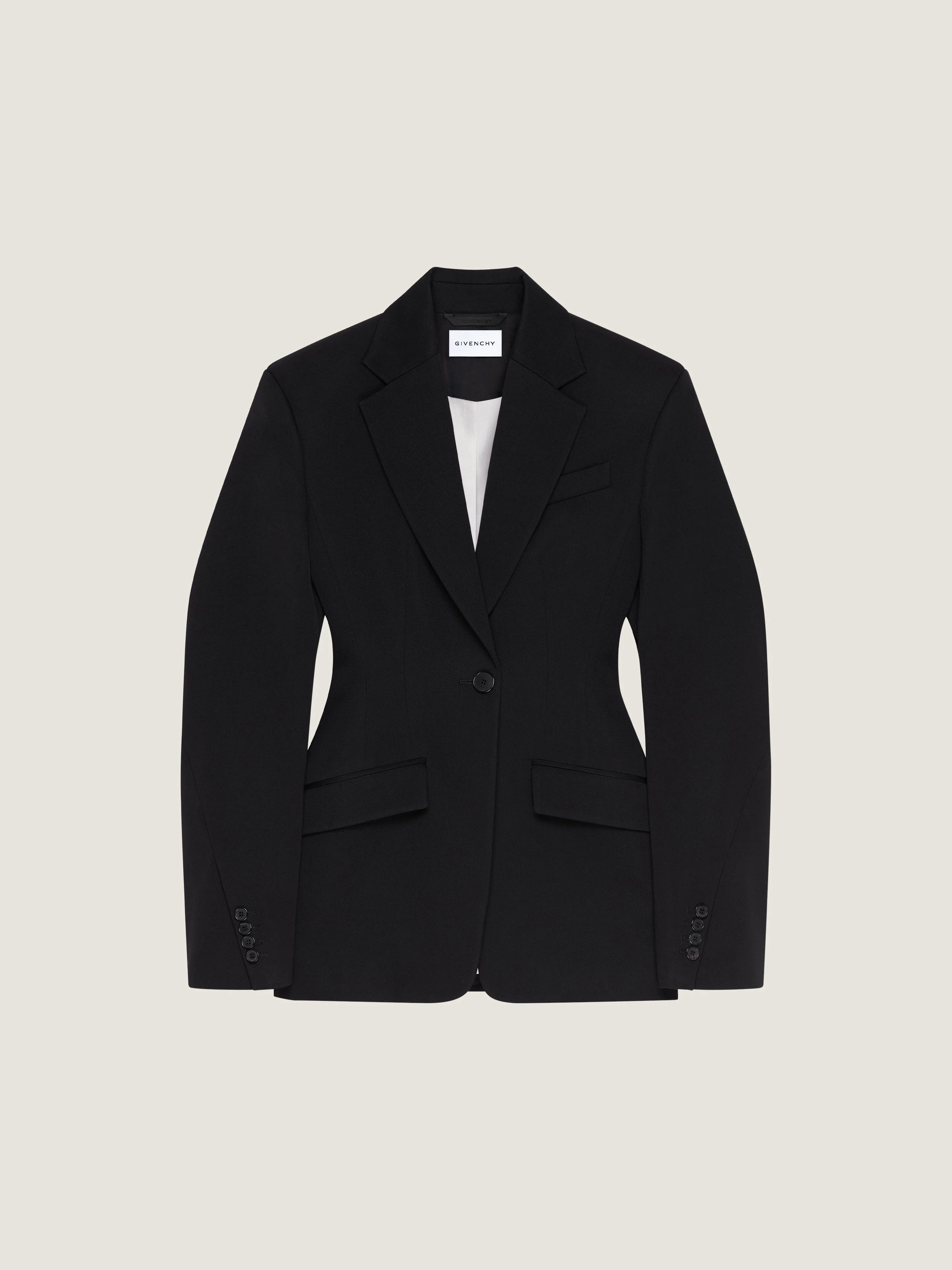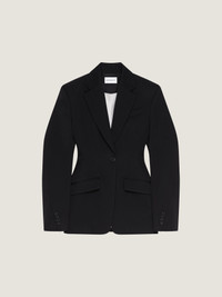 - Structured jacket in grain de poudre wool. - Notch lapel. - Single breasted. - Buttoned cuffs. - One chest pocket. - Two front flap pockets. - Satin lining. - Couture seams for a cocooning volume and cinched waist. - Model measures 5.8 Feet and wears a size 36.