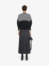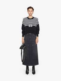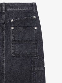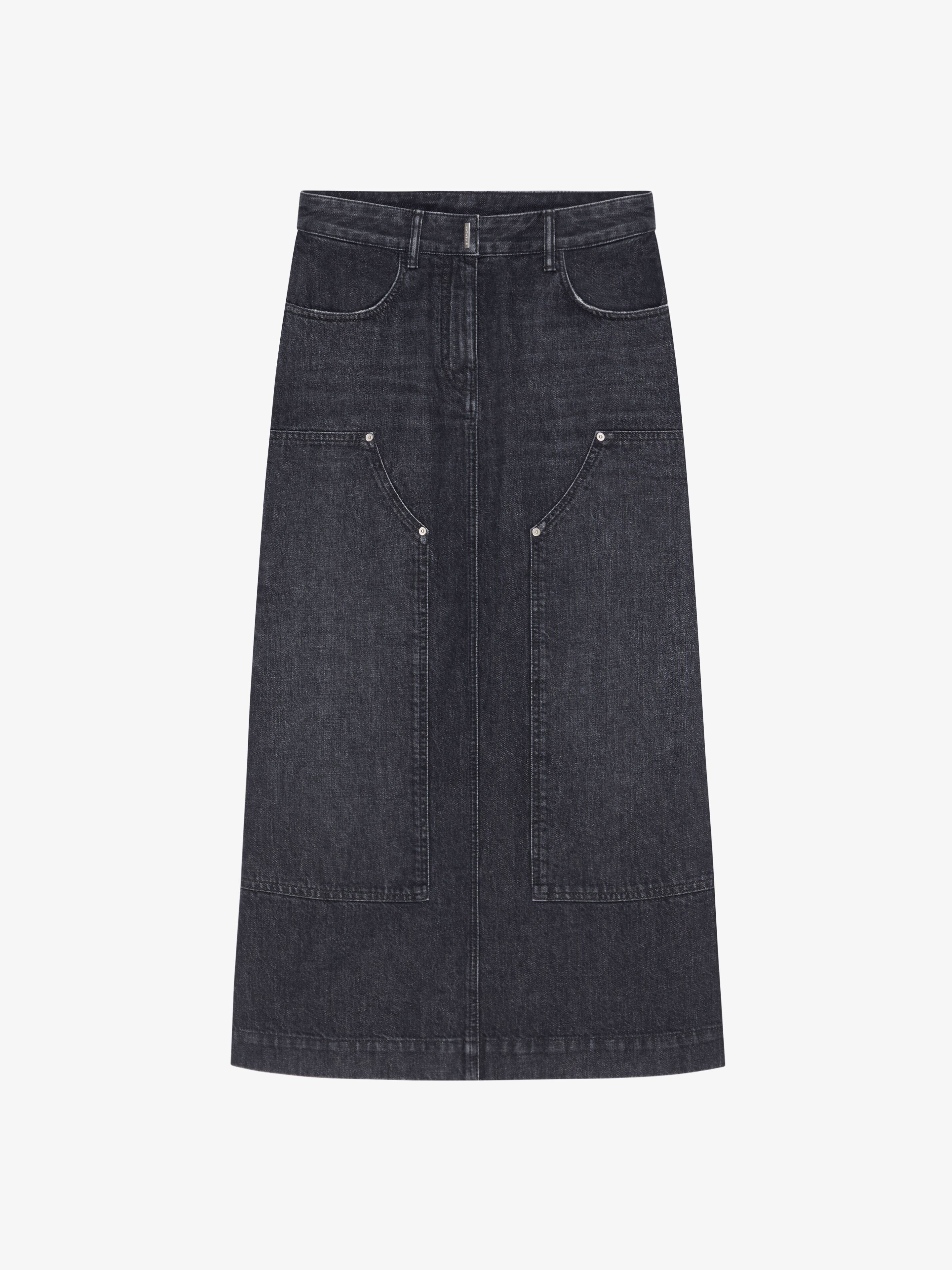 - Midi skirt in denim with patches on the front. - Waist with loops and zipped closure with metal bar GIVENCHY. - Two front pockets. - Two pockets and one hidden pocket on the back. - 4G metal rivets in the back. - Slit in the back. - Straight cut. - Model measures 69.7 in and wears a size 36.