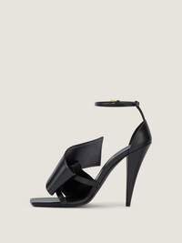 - Heeled sandals in calfskin leather. - Sliced Square line. - Twisted strap on top. - Thin ankle strap with metal buckle. - Squared toe. - Curvaceous cone heel. - GIVENCHY label on the leather insole. - Heel height: 3.7 in.