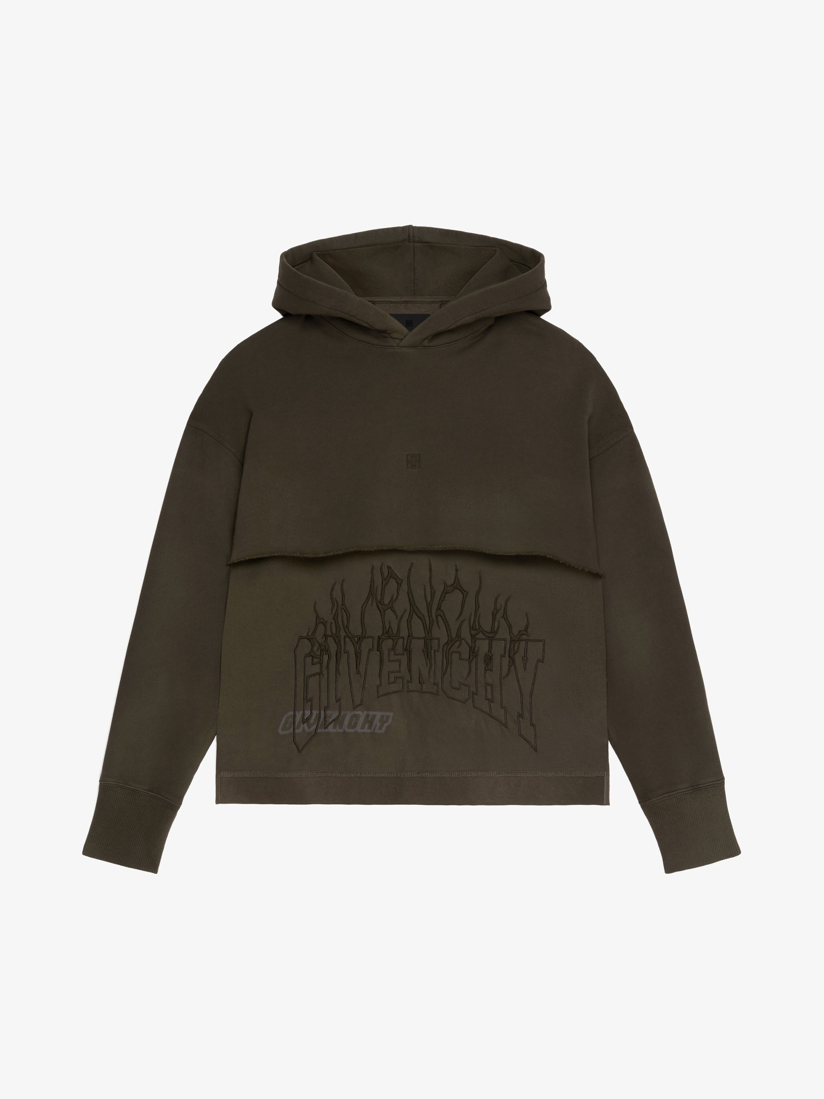 - Slim-fit hoodie in soft jersey with three-layer overlay effect on the body. - Mix of printed and embroidered GIVENCHY signatures on the middle layer. - GIVENCHY embroidered high-neck collar. - 4G emblem embroidered on the front. - GIVENCHY signature embroidered on the back. - Raw-edged cut-outs on the two top layers.