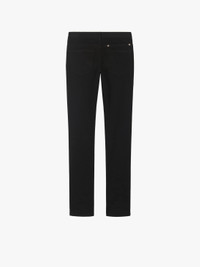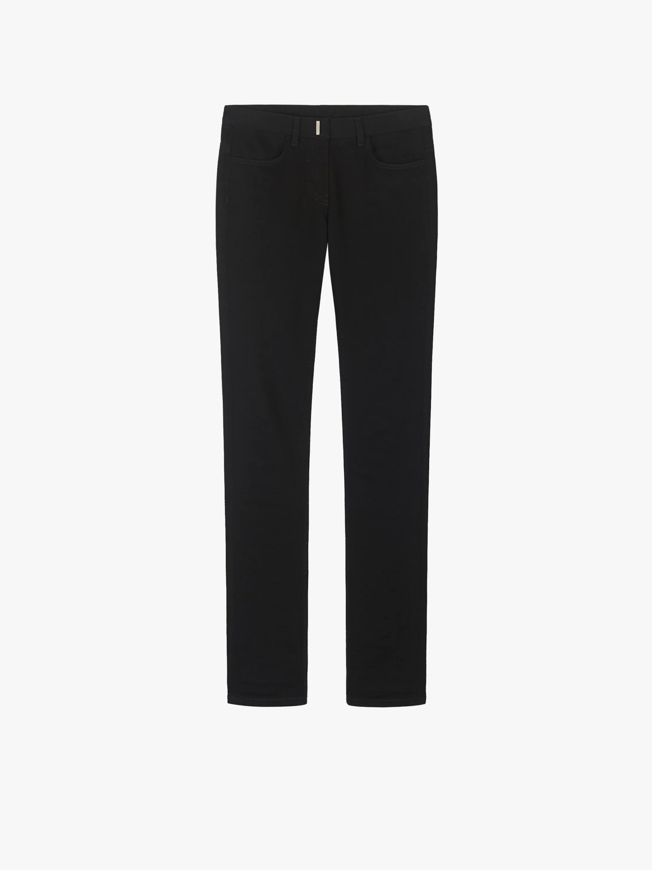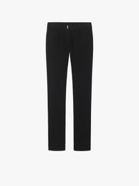 - Stretch denim jeans. - Color: black. - Metal GIVENCHY-engraved barrette closure. - Two side pockets. - Two patch pockets and one hidden pocket with 4G rivets on the back. - Slim fit.