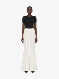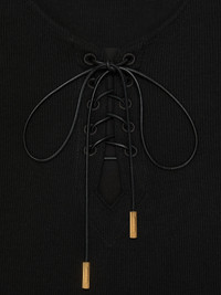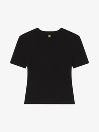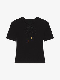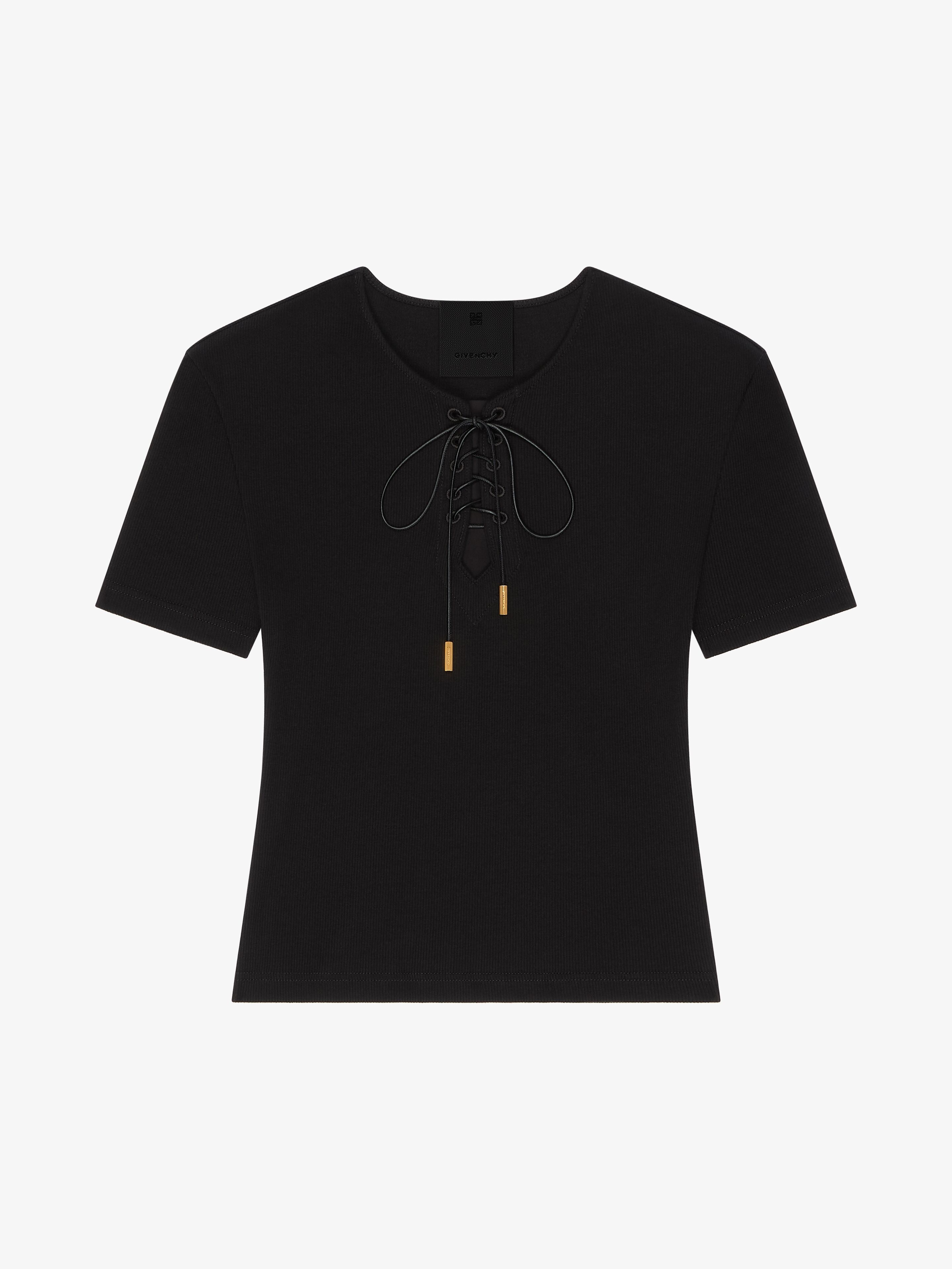 - Inspired by Hubert de Givenchy's 1970s style, the collection is adorned with laced details that evoke a subtle sensuality and bold femininity. - Short-sleeved t-shirt in ribbed cotton. - Crew neck. - Front laces with GIVENCHY engraved metal tips. - Golden-finish 4G Liquid metal piece on the upper back. - Slim fit. - Model measures 5.8 Feet and wears a size XS.