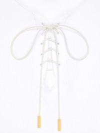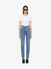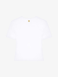 - Inspired by Hubert de Givenchy's 1970s style, the collection is adorned with laced details that evoke a subtle sensuality and bold femininity. - Short-sleeved t-shirt in ribbed cotton. - Crew neck. - Front laces with GIVENCHY engraved metal tips. - Golden-finish 4G Liquid metal piece on the upper back. - Slim fit. - Model measures 5.8 Feet and wears a size XS.