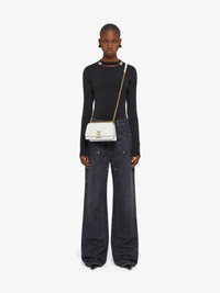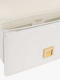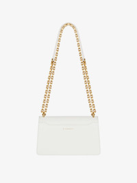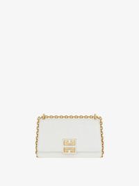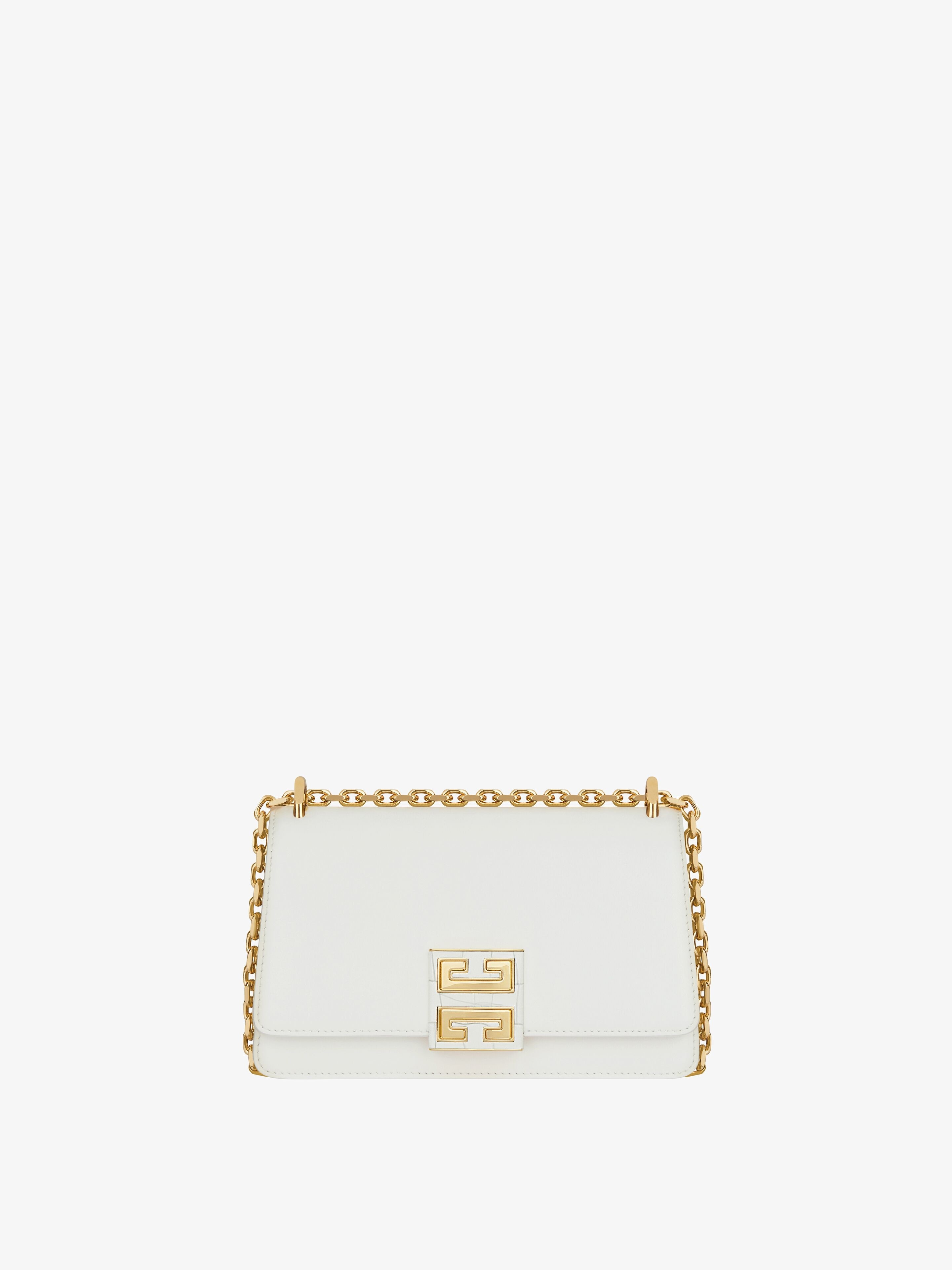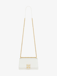 - Small crossbody bag in calfskin leather. - 4G line. - Flap with 4G magnetic metal clasp. - Sliding chain featuring G links and leather reinforcement for crossbody or short shoulder carrying. - Golden-finish metal details. - One main compartment divided in three sections and one card slot. - One flat pocket with silvery embossed GIVENCHY signature on the back. - Strap length: 22 in. - Leather lining. - Additional flat zipped pouch sold separately.