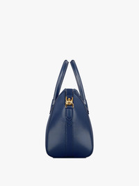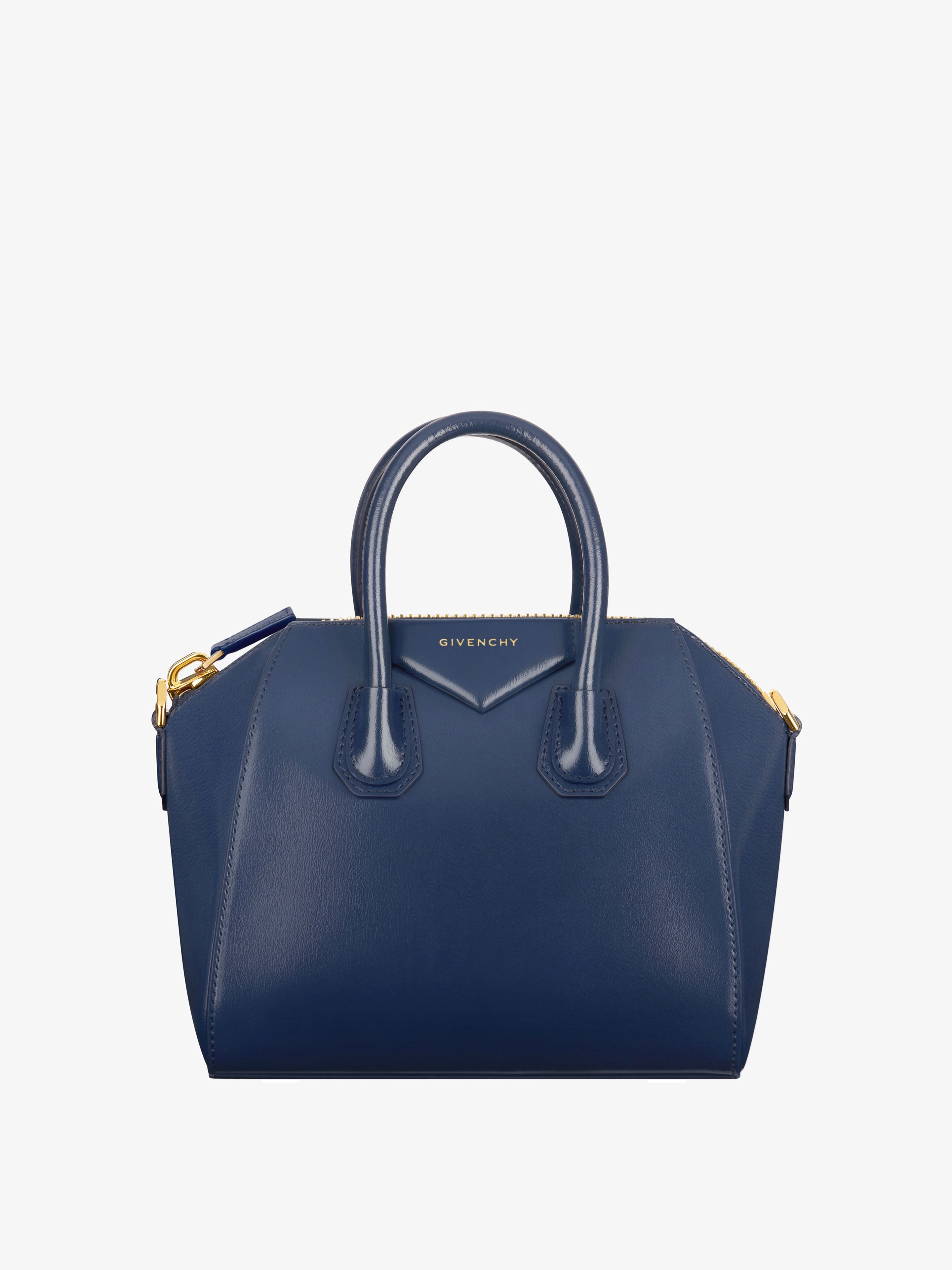 - Handbag in smooth Box calfskin leather. - Antigona line. - Zipper closure with leather zipper pull. - Pentagonal patch with GIVENCHY signature. - Removable leather shoulder strap. - Gold-finish metal details. - Two flat pockets and one zippered pocket inside.