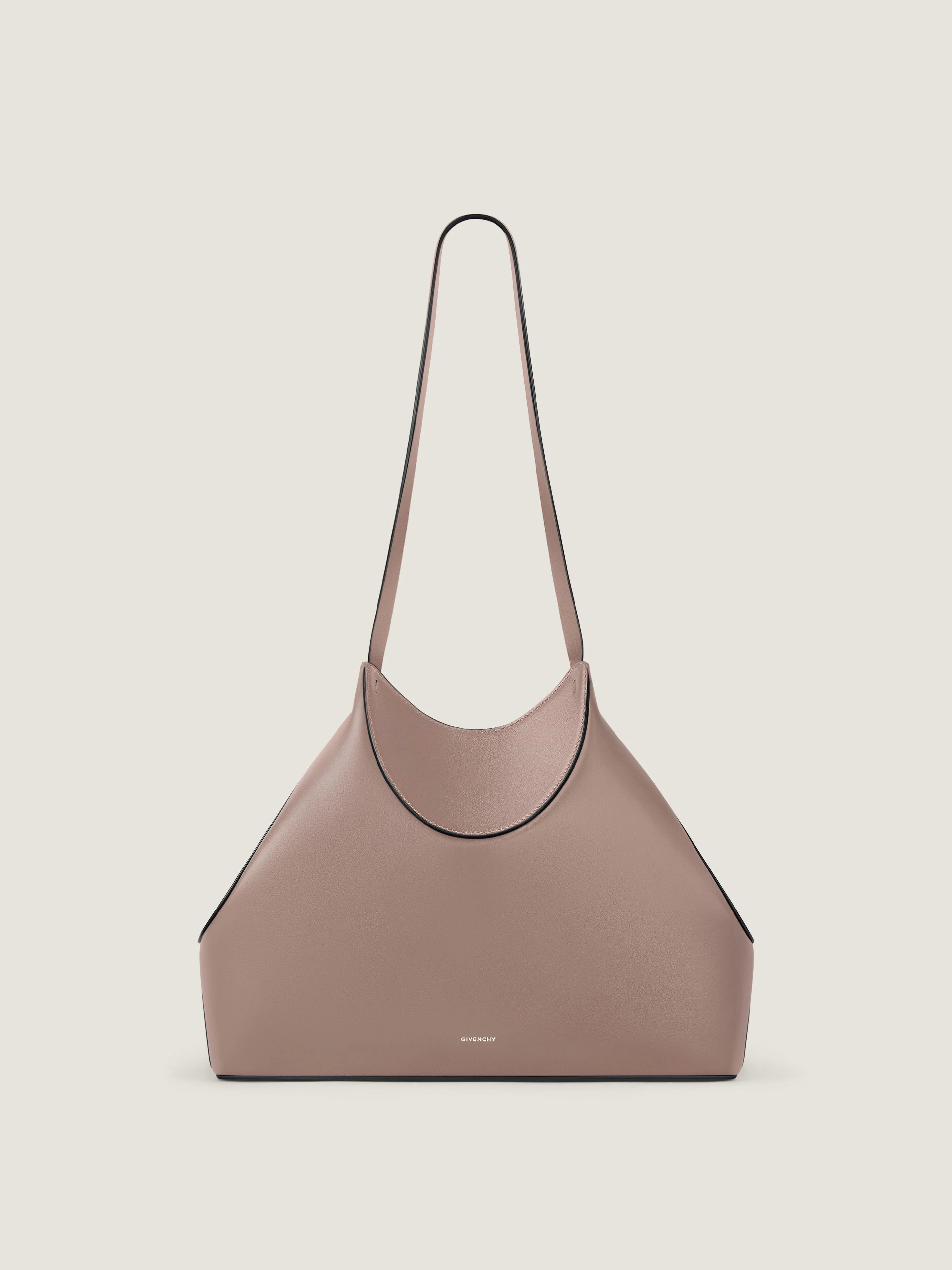 - Small tote bag in soft grained calfskin leather. - Facet line. - Geometric shape. - Magnetic closure. - Leather handles for shoulder carrying. - GIVENCHY signature embossed on the front and GIVENCHY Paris signature on the inside. - Silvery-finish metal details. - Contrasted hand made edges. - Contrasting crescent shapes on the inside. - One main compartment with one flat pocket inside. - Nappa lining.
