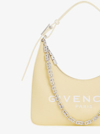 - Small shoulder bag in washed cotton canvas, with leather finish. - Moon Cut Out line. - Adjustable and removable leather handle with GIVENCHY-engraved metal buckle. - Zipper closure with GIVENCHY 4G zipper pull. - G Cube chain on the front. - Contrasted GIVENCHY PARIS signature printed on the front. - Silvery-finish metal details. - One main compartment. - Strap length : 13 in. Handle length : 8 in. - Canvas lining.