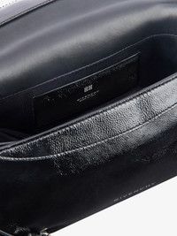 - Small shoulder bag in shiny patent calfskin leather. - Voyou line. - Flap with magnetic closure. - Short adjustable and removable leather strap offering hand or shoulder carrying. - GIVENCHY signature embossed on the front of the bag and on the top of the strap. - GIVENCHY engraved metal buckles. - Silvery-finish metal details. - Two compartments with a central separation and one card slot inside. - Cotton lining.