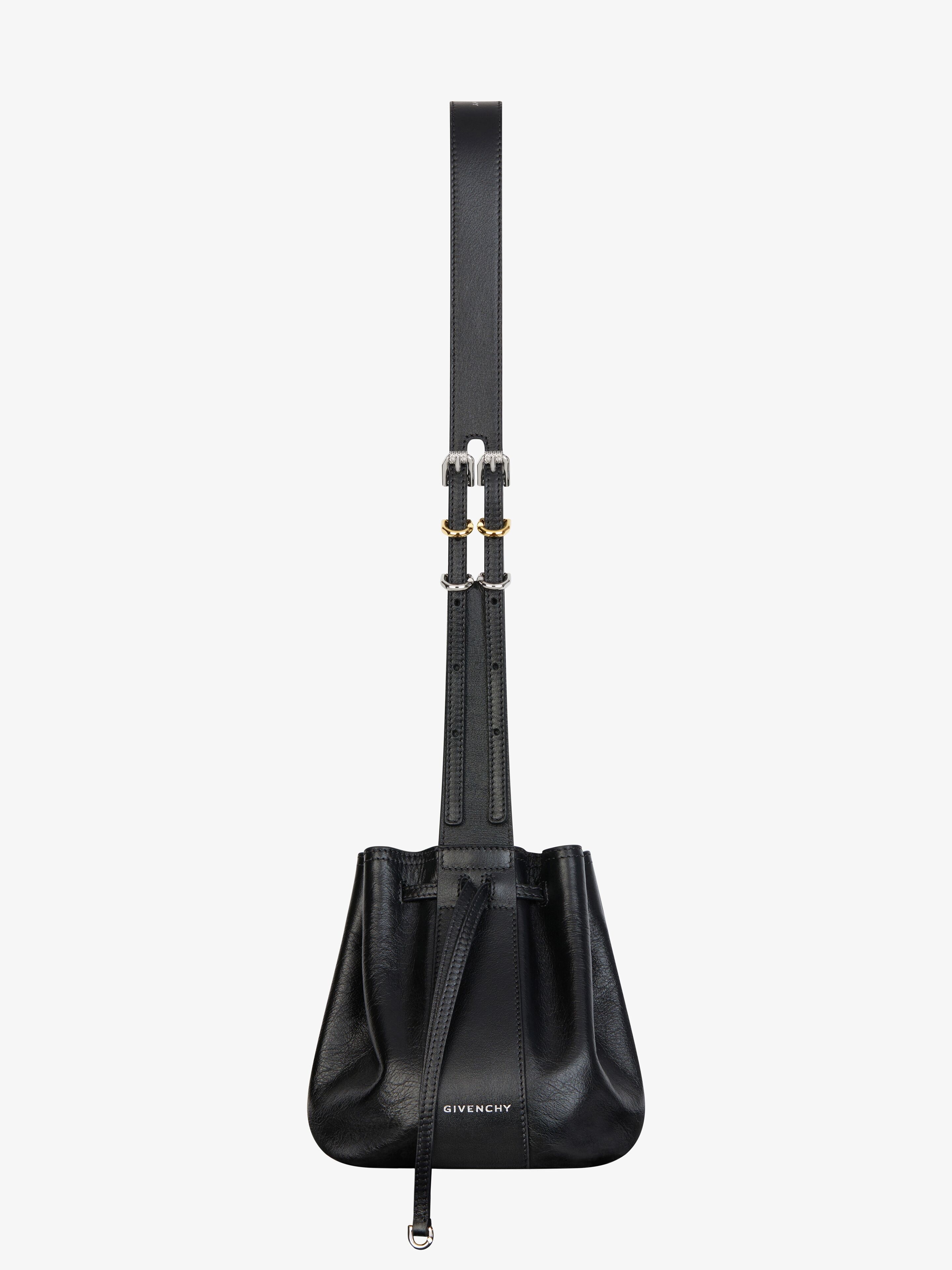 - Small round crossbody bag in tumbled calfskin leather. - Pumpkin line. - Drawstring closure on each side of the bag to easily access your belongings. - Adjustable leather strap with metal buckles offering shoulder or crossbody carrying. - GIVENCHY signature embossed on the top of the strap. - Leather band enhancing the bag's structure with embossed GIVENCHY signature on the front and back. - GIVENCHY label at the bottom the bag. - Golden and silvery-finish metal details. - One main compartment. - Suede lining.