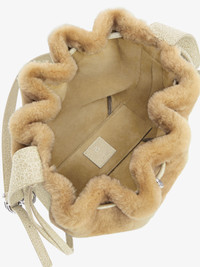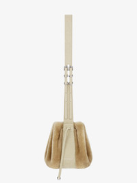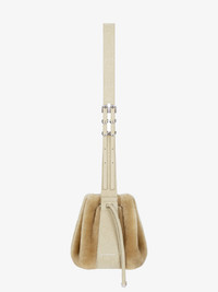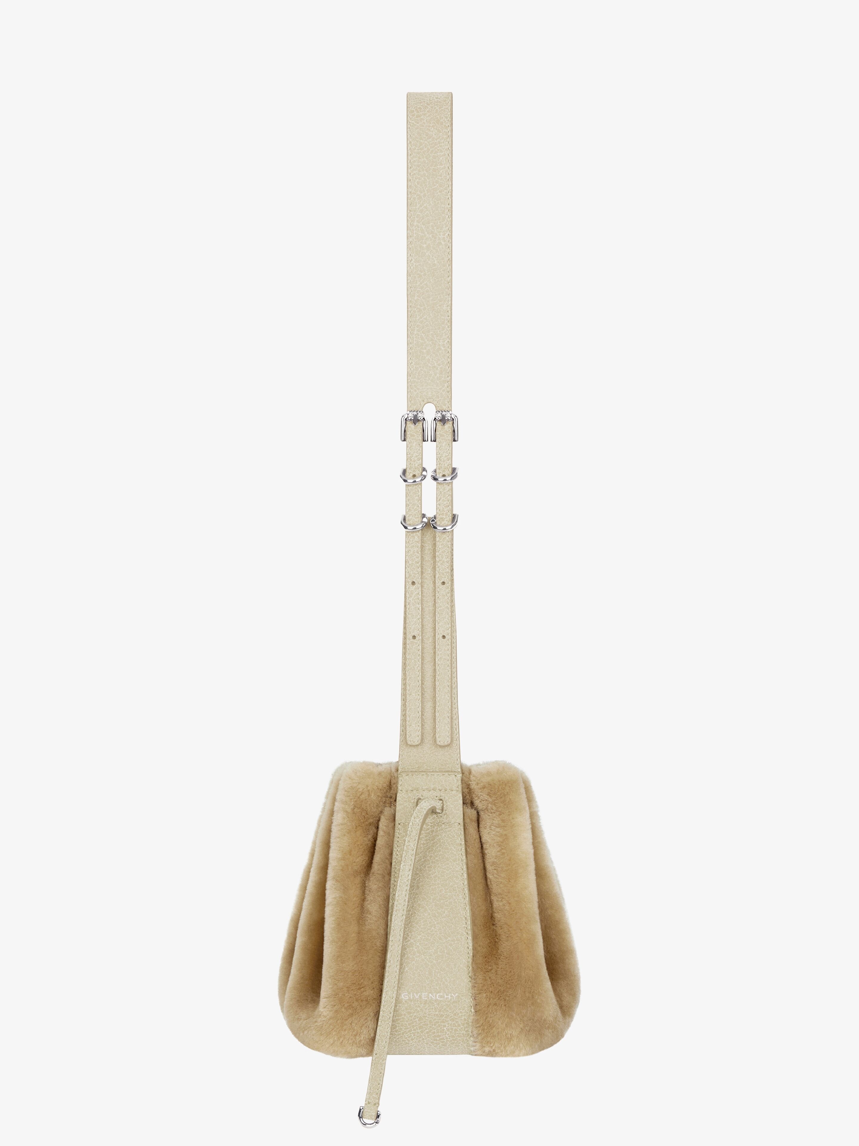 - Small round crossbody bag in fluffy shearling. - Pumpkin line. - Drawstring closure on each side of the bag to easily access your belongings. - Adjustable leather strap with metal buckles offering shoulder or crossbody carrying. - GIVENCHY signature embossed on the top of the strap. - Leather band enhancing the bag's structure with embossed GIVENCHY signature on the front and back. - GIVENCHY label at the bottom the bag. - Golden-finish metal details. - One main compartment. - Suede lining.