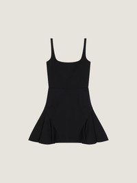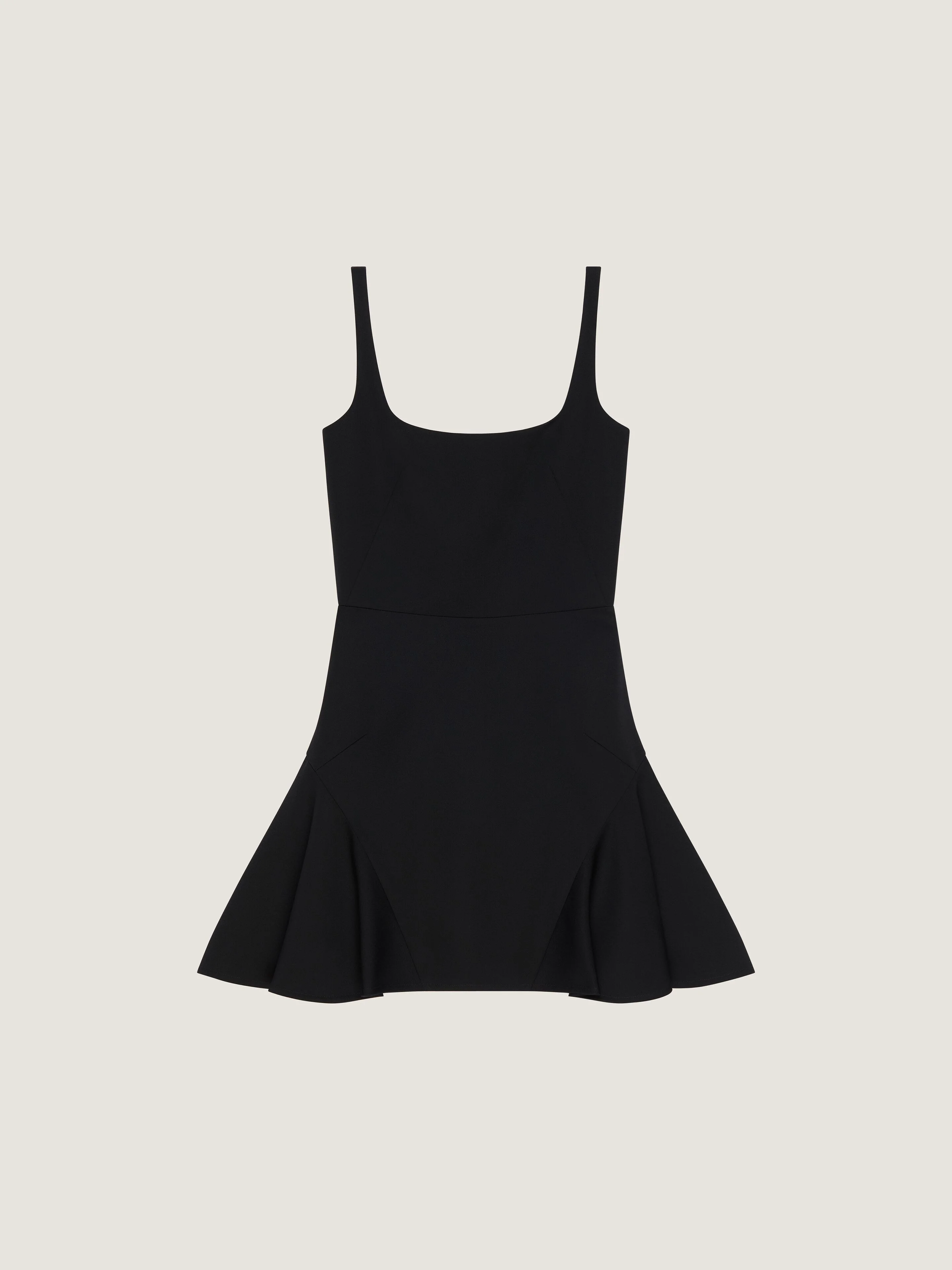 - Mini straps dress in cady. - Square neckline. - Ruffled skirt with volume. - Invisible zipped closure on the side. - Model measures 5.8 Feet and wears a size 36.