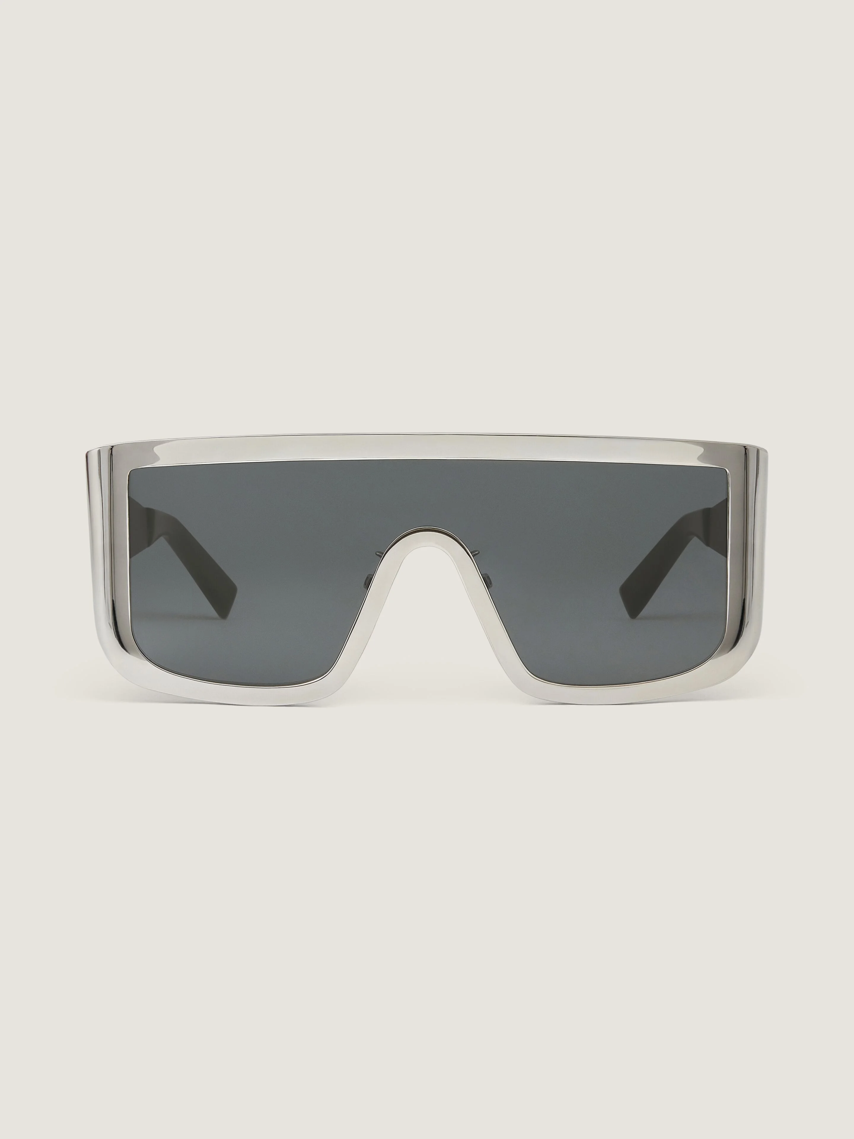 - Sunglasses in metal. - Square line. - Mask shape. - Smoke lenses. - Adjustable nose pads. - GIVENCHY signature engraved on the temples. - Acetate end-tips for comfort. - 100% UVA/UVB protection. - Weight: 65g. - Model comes in a case.