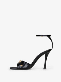 - Sandals in brushed calfskin leather. - Stitch line. - Five golden-finish metal rings with strass, stitch style on the top. - Slightly squared toe. - Lacquered heel. - Thin ankle strap with metal buckle and split detail at the back of the foot. - GIVENCHY signature debossed on the leather insole. - Heel height: 3.7 in.
