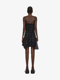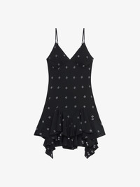 - Short dress with thin straps in silk with 4G plumetis in lurex thread. - Asymmetrical ruffles on the bottom of the dress. - V-neck. - Invisible zipped closure.