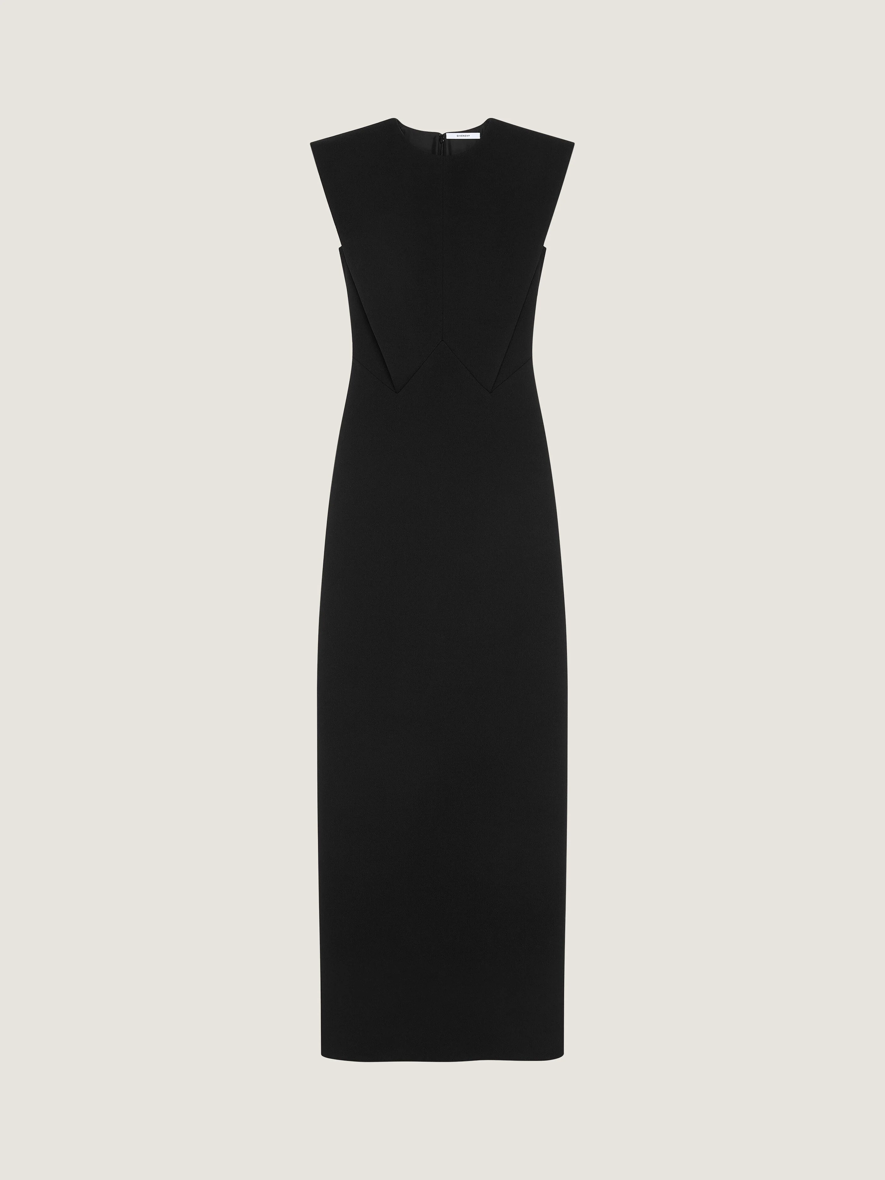 - Long sleeveless evening dress in wool crepe. - Crew neck. - Invisible zipped closure on the back. - Structured details. - Model measures 5.8 Feet and wears a size 36.