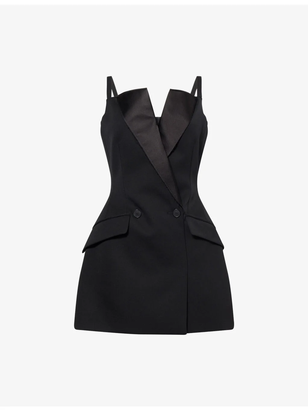 PRODUCT DETAILS - Givenchy wool mini dress - 100% wool; lining 70% silk, 30% polyester - Concealed zip fastening at back - Regular fit, mini length, shoulder straps, square neck, structured lapels, buttons at front, cinched waist, two flap pockets at front, lined - Dry clean - Made in Italy - True to size - Size UK 8: length 31in / 78.5cm - Model is 5ft 10in/1.78m and wears a size UK 8 - Midweight, non-stretch Ref: R04557388