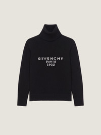 - Long-sleeved sweater in wool and cashmere. - Turtleneck. - GIVENCHY Paris 1952 jacquard on the front. - Ribbed collar hem and cuffs. - Model measures 5.8 Feet and wears a size XS.