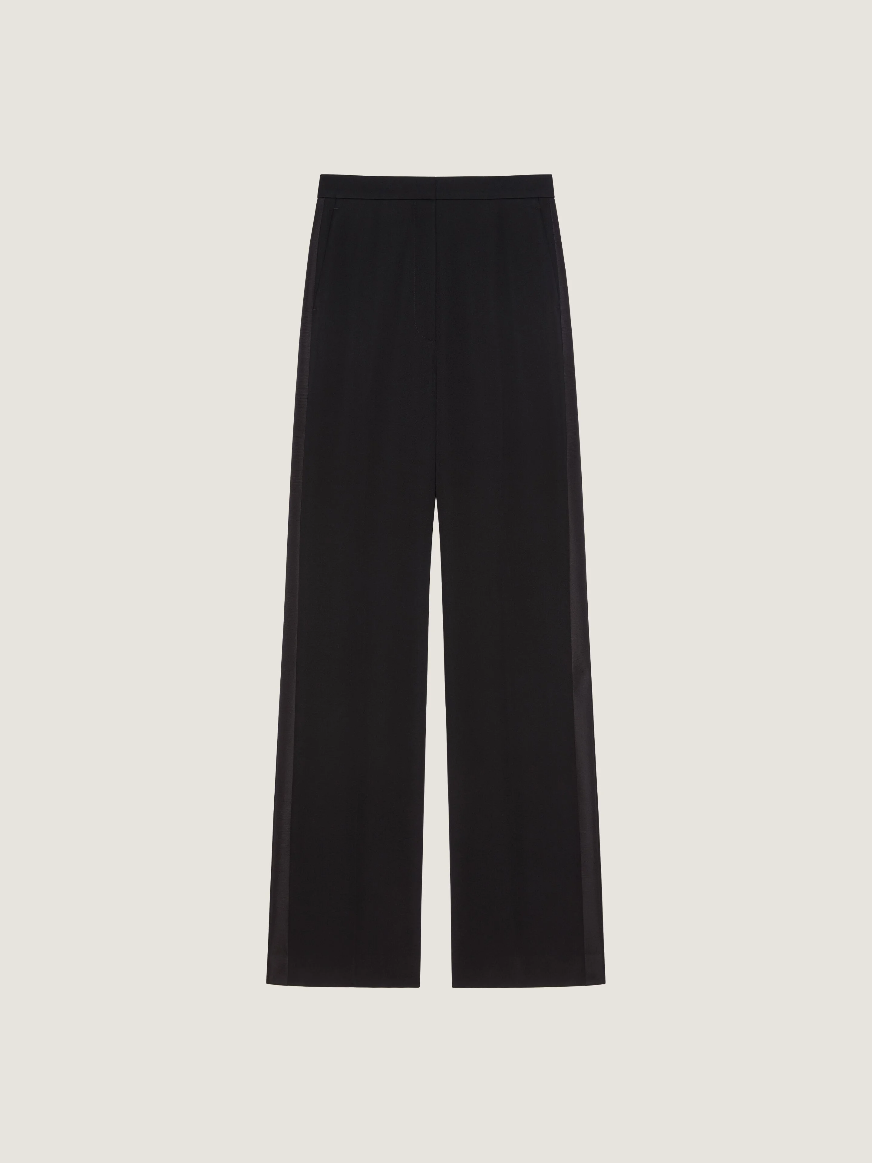 - Tailored cigarette pants in grain de poudre wool. - Zipped closure with hook. - Satin bands on the sides. - Two side pockets. - One back pocket. - Model measures 5.8 Feet and wears a size 36.