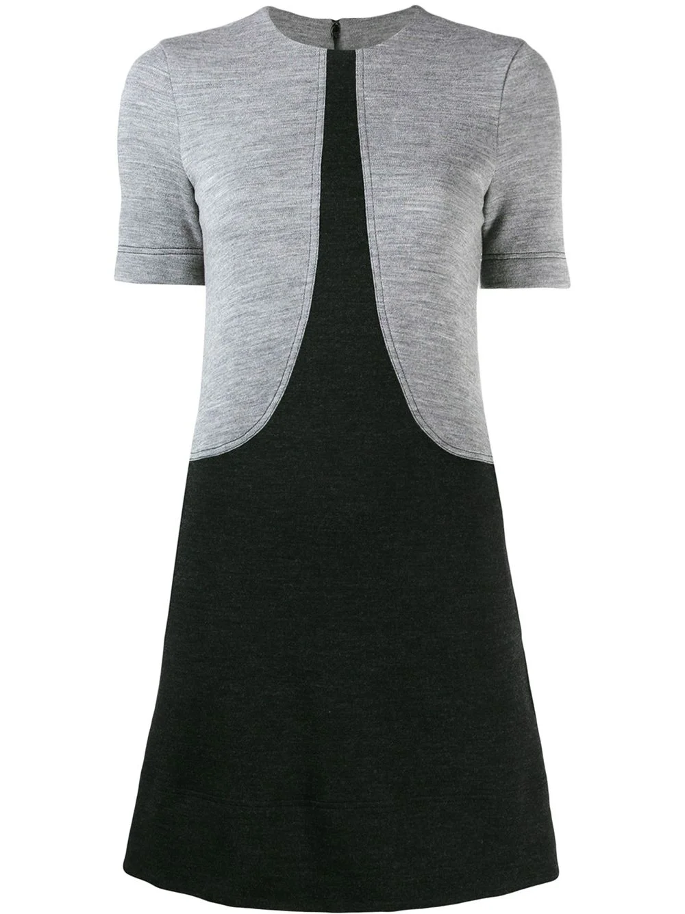 two-tone T-shirt dress This Givenchy heather grey dress is decorated with a contrasting black inset and features black topstiching. Shaped for a T-shirt dress, it is spun from wool with a round neck, short sleeves and a discreet concealed rear zip fastening. Made in Italy Composition Wool 100% SIZE & FIT Model measurements Height 5 ft 10 in(1.77 m) Bust/Chest 30.31 in(77 cm) Hips 34.25 in(87 cm) Waist 24.01 in(61 cm) FittingInformation This piece fits true to size. We recommend you get your regular size Cut for a slim fit Made with a mid-weight fabric Washing instructions Dry Clean Only