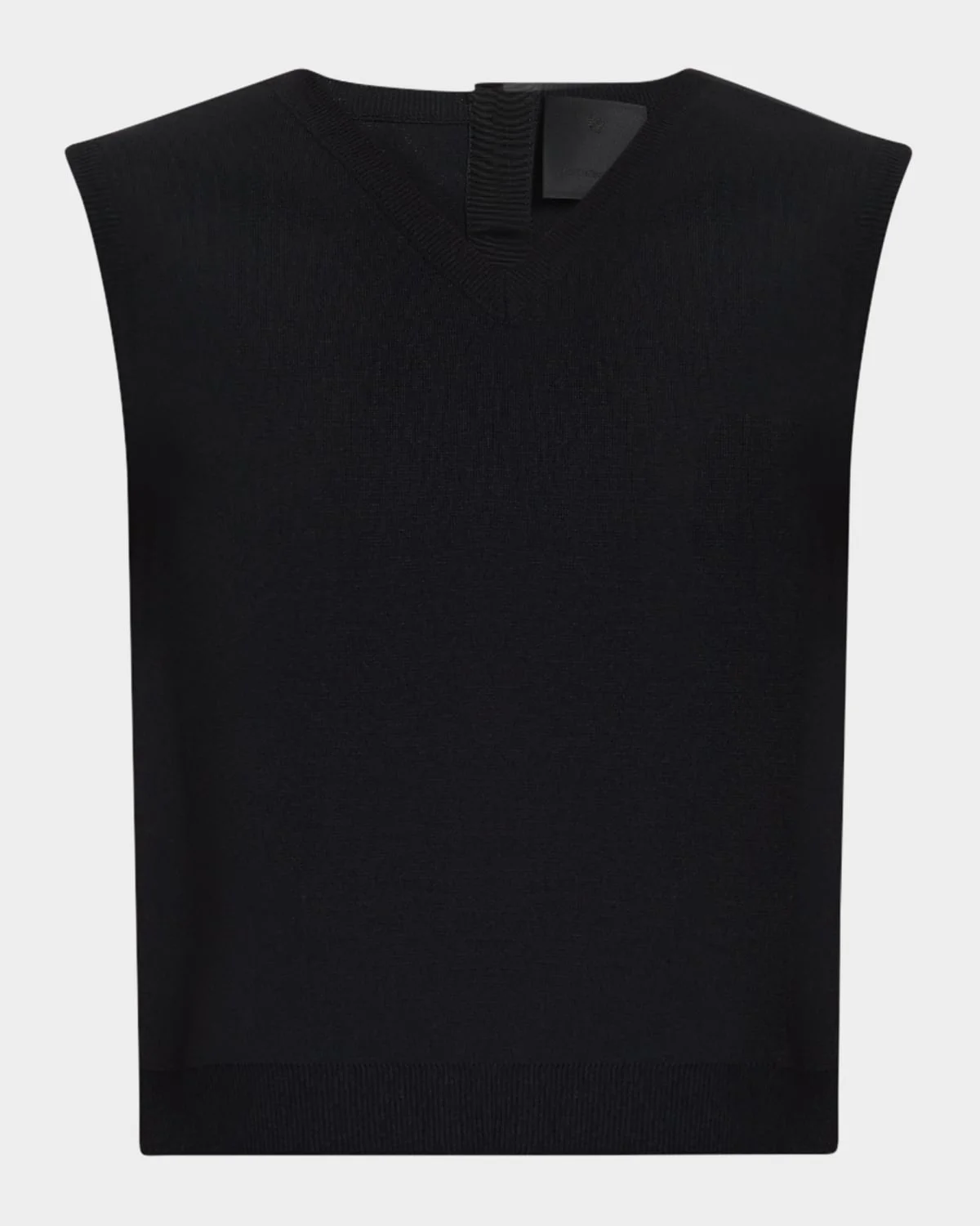 Givenchy knit vest featuring a buttonback detail V neckline Sleeveless Loose fit Ribbed hem Pullover style Viscose/nylon/polyamide/polyester Made in Italy