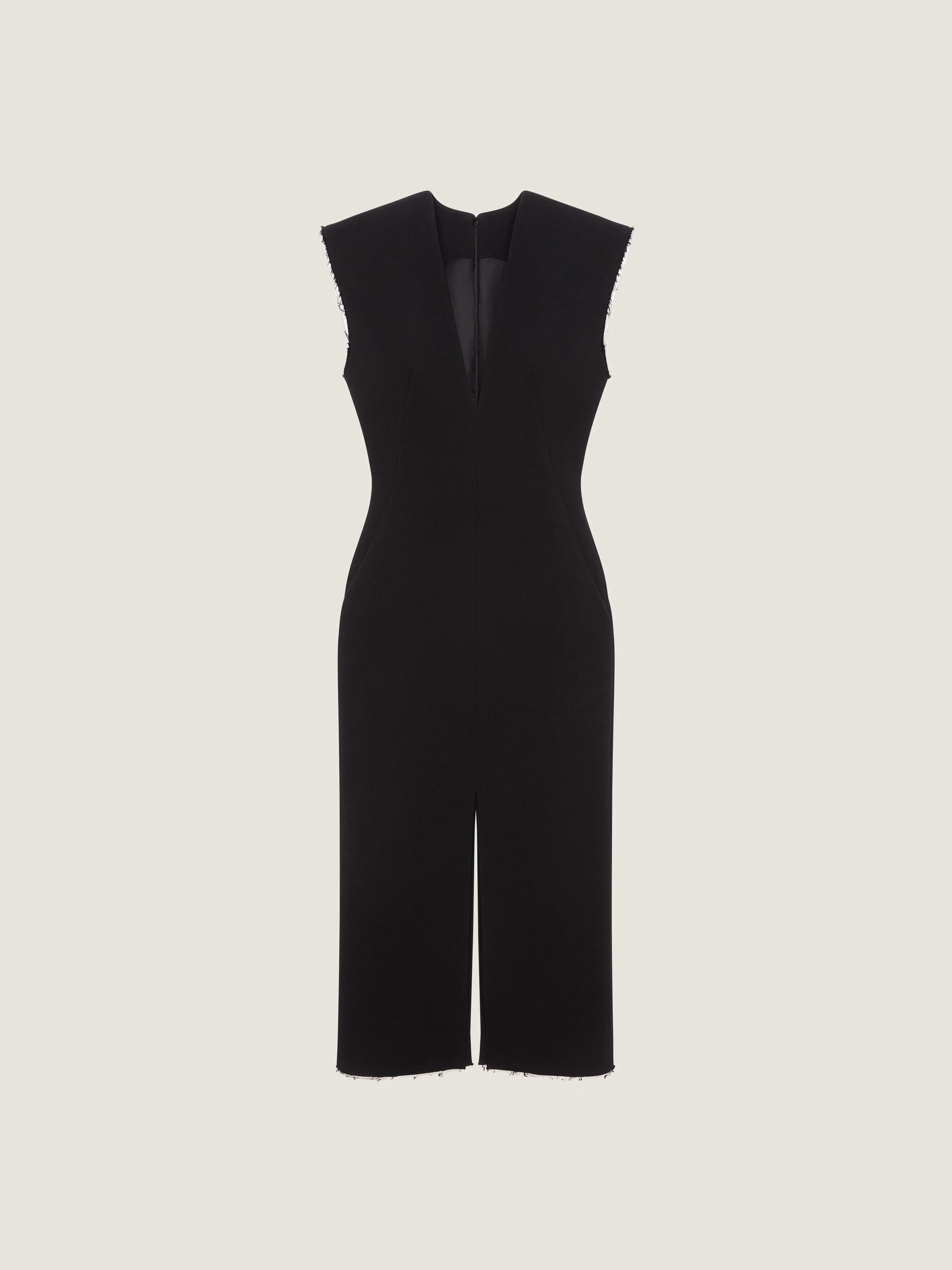 - Sleeveless midi sliced pencil dress in wool crepe. - V neckline. - Invisible zipped closure on the back. - Structured details. - Front and back slit. - Raw edges. - Model measures 5.8 Feet and wears a size 36.