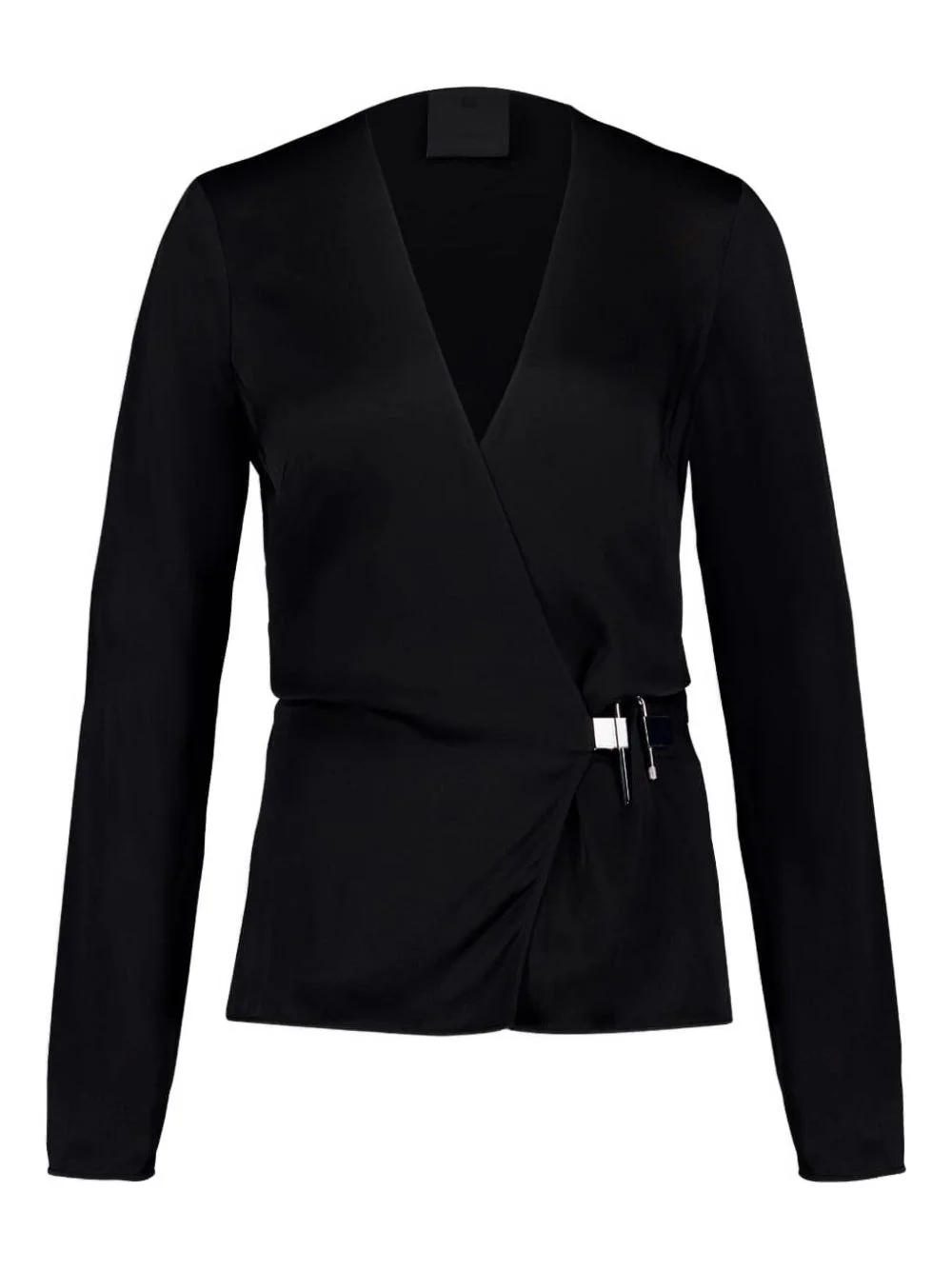 V-neck satin wrap top Highlights - Black - V-neck - Wrap fastening - Long sleeves - Satin crepe - Buckle detail Imported Composition Viscose 58%, Acetate 42% Washing instructions Read Manufacturer Guidelines
