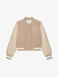 - Varsity jacket in alpaca bouclette wool. - Sleeves in nappa leather. - G patch embroidered on the chest. - Ribbed elasticated knit collar, cuffs and hem with contrasting stripes. - Snap closure. - Two side pockets. - Classic fit. - Model measures 5.8 Feet and wears a size 36.