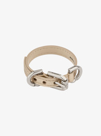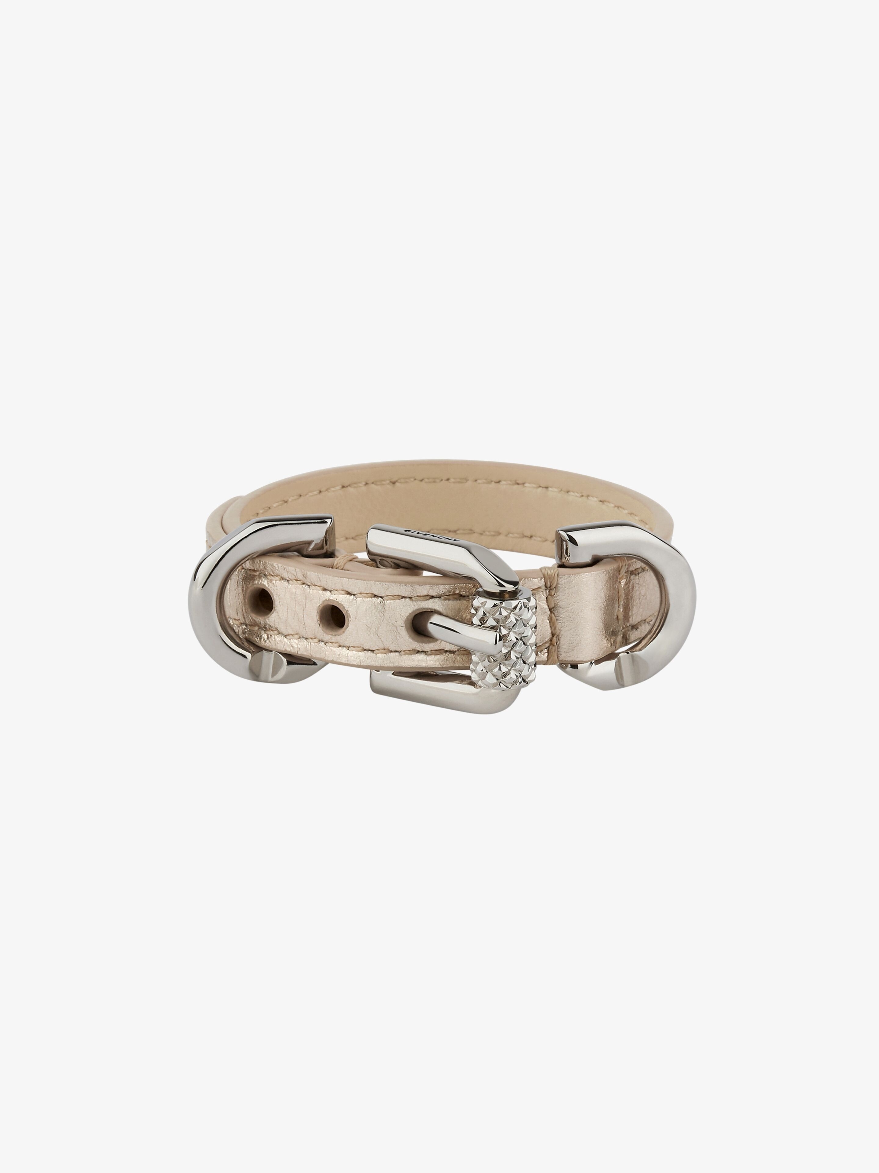 - Bracelet in laminated calfskin leather. - Voyou line. - Silvery-finish GIVENCHY engraved metal buckles. - GIVENCHY signature with hot stamping on the back. - Three adjustment holes.