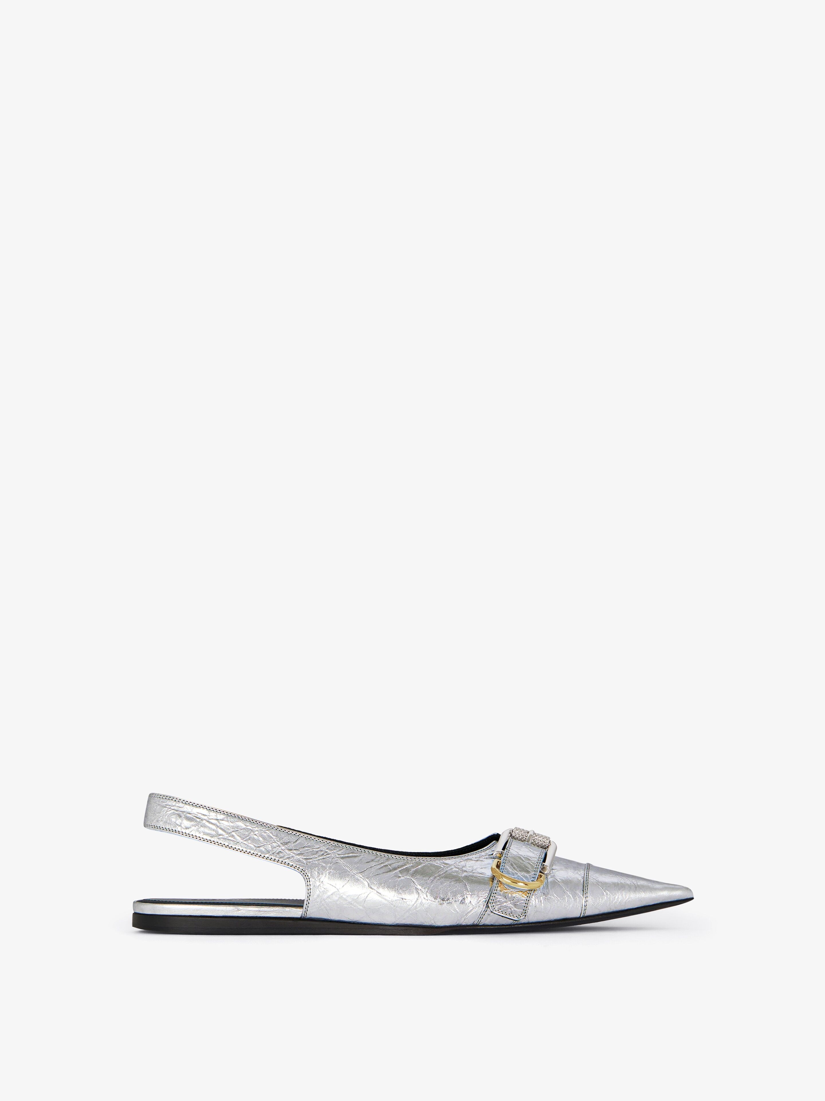 - Flat slingback in laminated lambskin. - Voyou line. - Strap on top with metal buckle. - Thin back strap. - GIVENCHY signature debossed on the leather insole. - Golden and silvery-finish metal details. - Pointy toe.