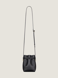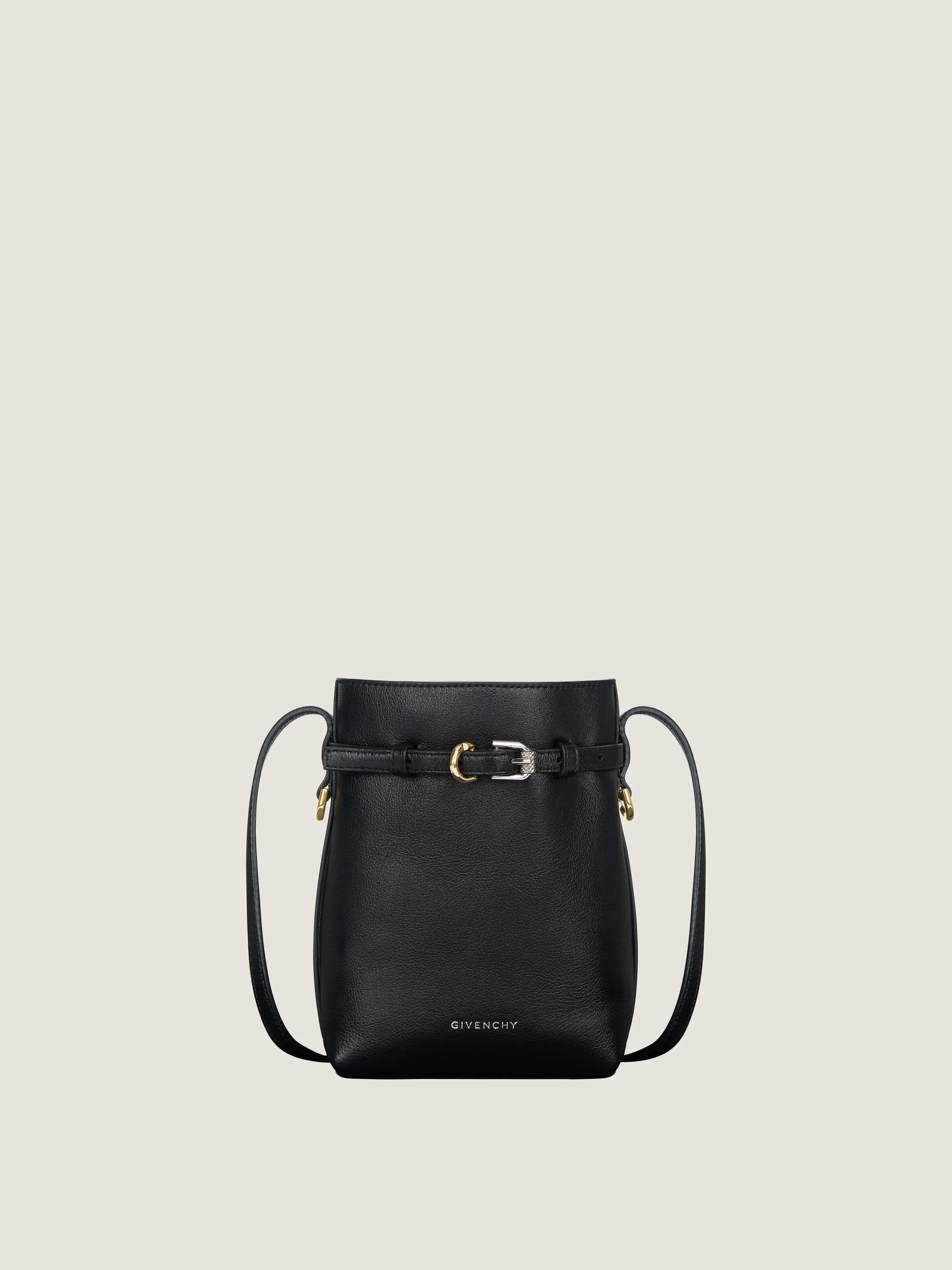 - Phone pouch in tumbled calfskin leather. - Voyou line. - Thin leather strap allowing crossbody carrying. - GIVENCHY signature embossed on the front. - Adjustable leather strap with GIVENCHY engraved metal buckles on the front. - Golden and silvery-finish metal details. - One main compartment. - Suede lining.