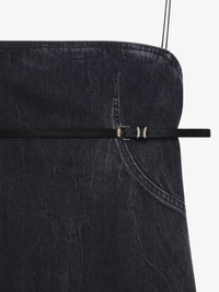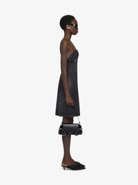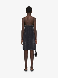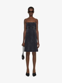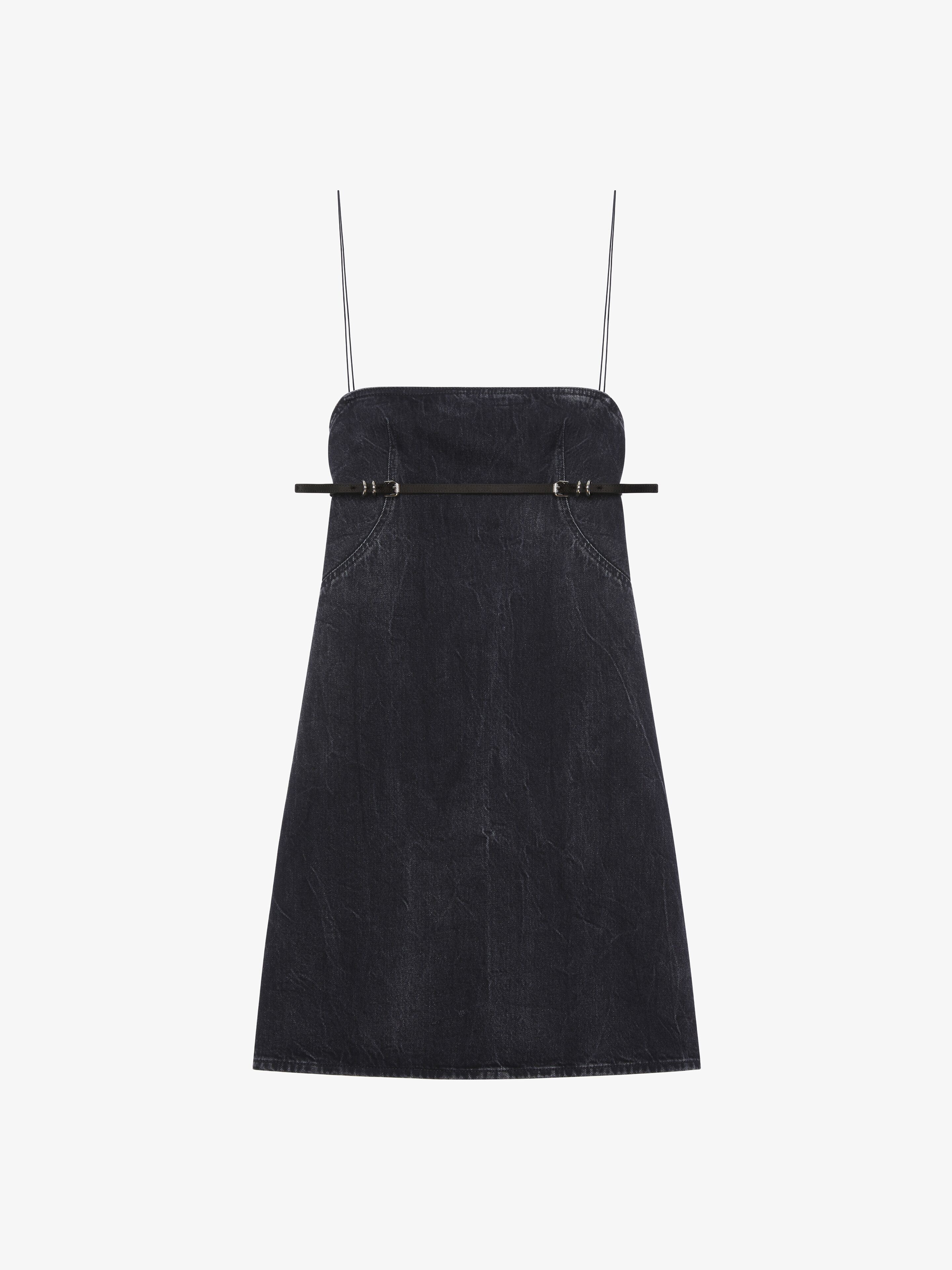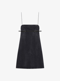 - Mid-length dress with thin straps in denim. - Voyou line. - Bustier-style neckline. - Adjustable and removable satin belt under the chest with GIVENCHY engraved metal buckles. - Open back. - Invisible zipped closure on the side. - Silvery-finish metal details. - Model measures 5.8 Feet and wears a size 36.