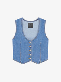 - Sleeveless waistcoat in denim. - Voyou line. - Crew neck. - Button closure. - Adjustable denim belt with GIVENCHY engraved metal buckles on the back. - Silvery-finish metal details. - Model measures 69.7 in and wears a size 36.