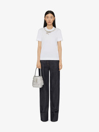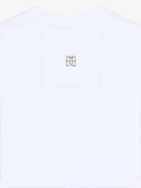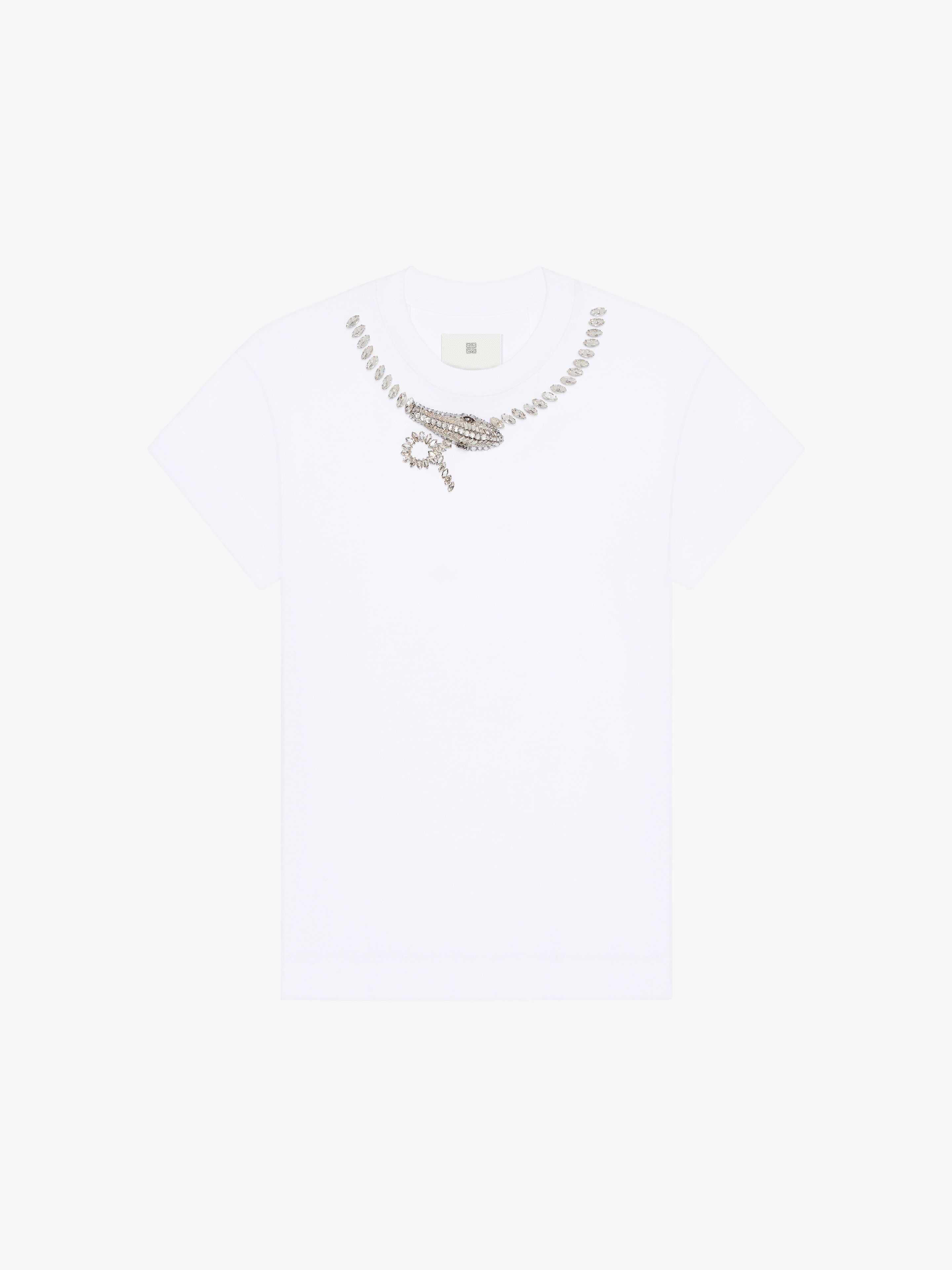 - Short-sleeved t-shirt in cotton. - Crew neck. - Crystals snake embroidered on the front. - Silvery-finish 4G Liquid metal piece on the upper back. - Slim fit. - Model measures 5.8 Feet and wears a size XS.