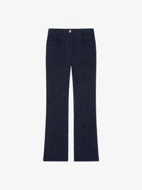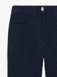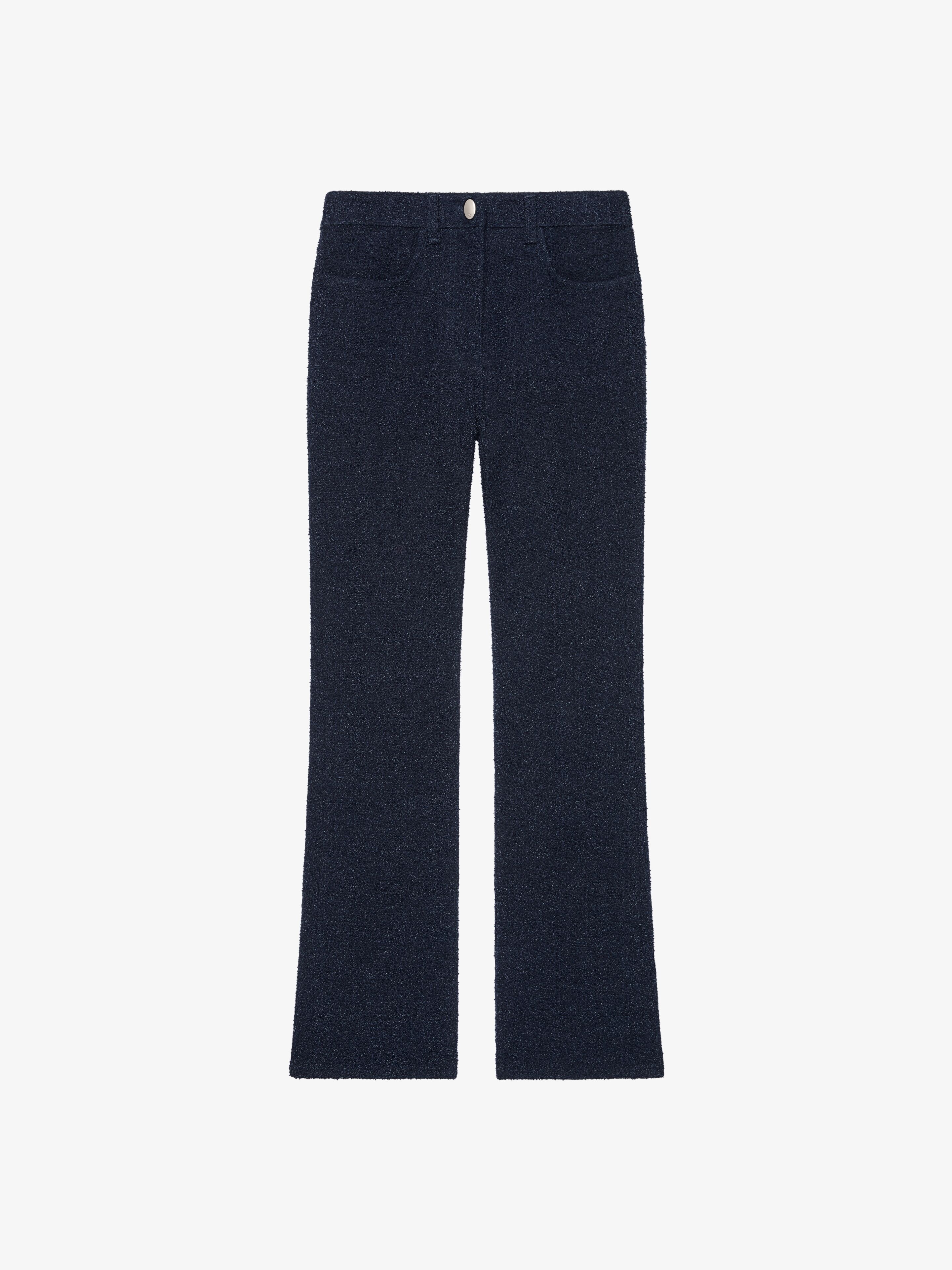 - Jeans in curly denim. - Waist with loops, zipped and button closure. - 4G engraved oval button. - Two front pockets. - Two back pockets and one hidden pocket on the back. - 4G metal rivets in the back. - Classic fit and flare legs. - Model measures 5.8 Feet and wears a size 26.