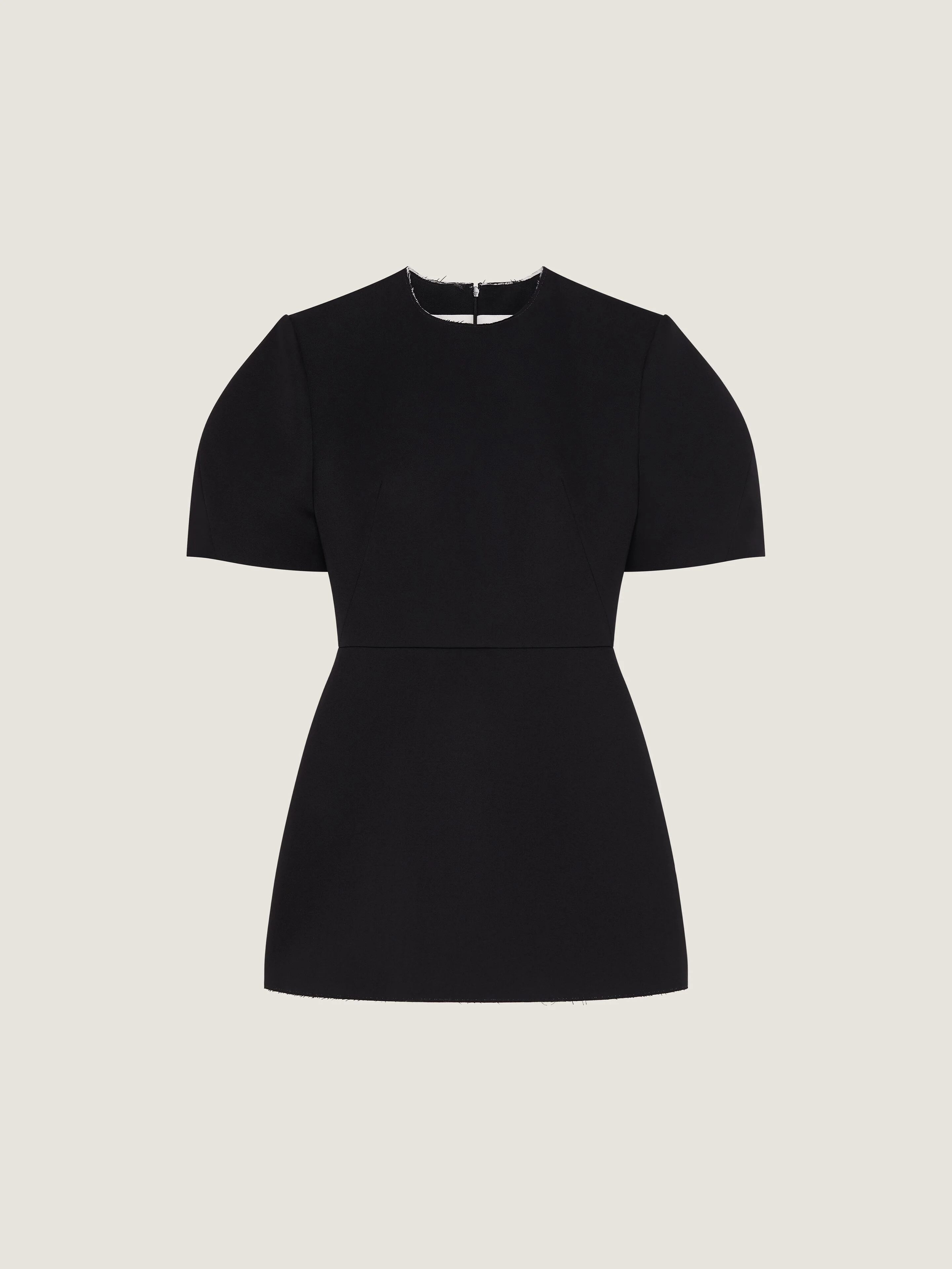 - Mini dress with short sleeves in grain de poudre wool. - Crew neck with raw edges. - Invisible zipped closure on the back. - Couture seams for a cocooning volume and cinched waist. - Model measures 5.8 Feet and wears a size 36.