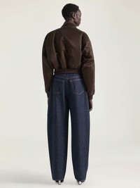 - Bomber in synthetic fiber. - Shawl collar with double zippers. - Zipped closure. - Two side flap pockets. - One zipped multi-pocket on the left sleeve. - Elasticated knitted hem and cuffs. - Bias seams for a cocooning volume. - Model measures 5.8 Feet and wears a size 36.
