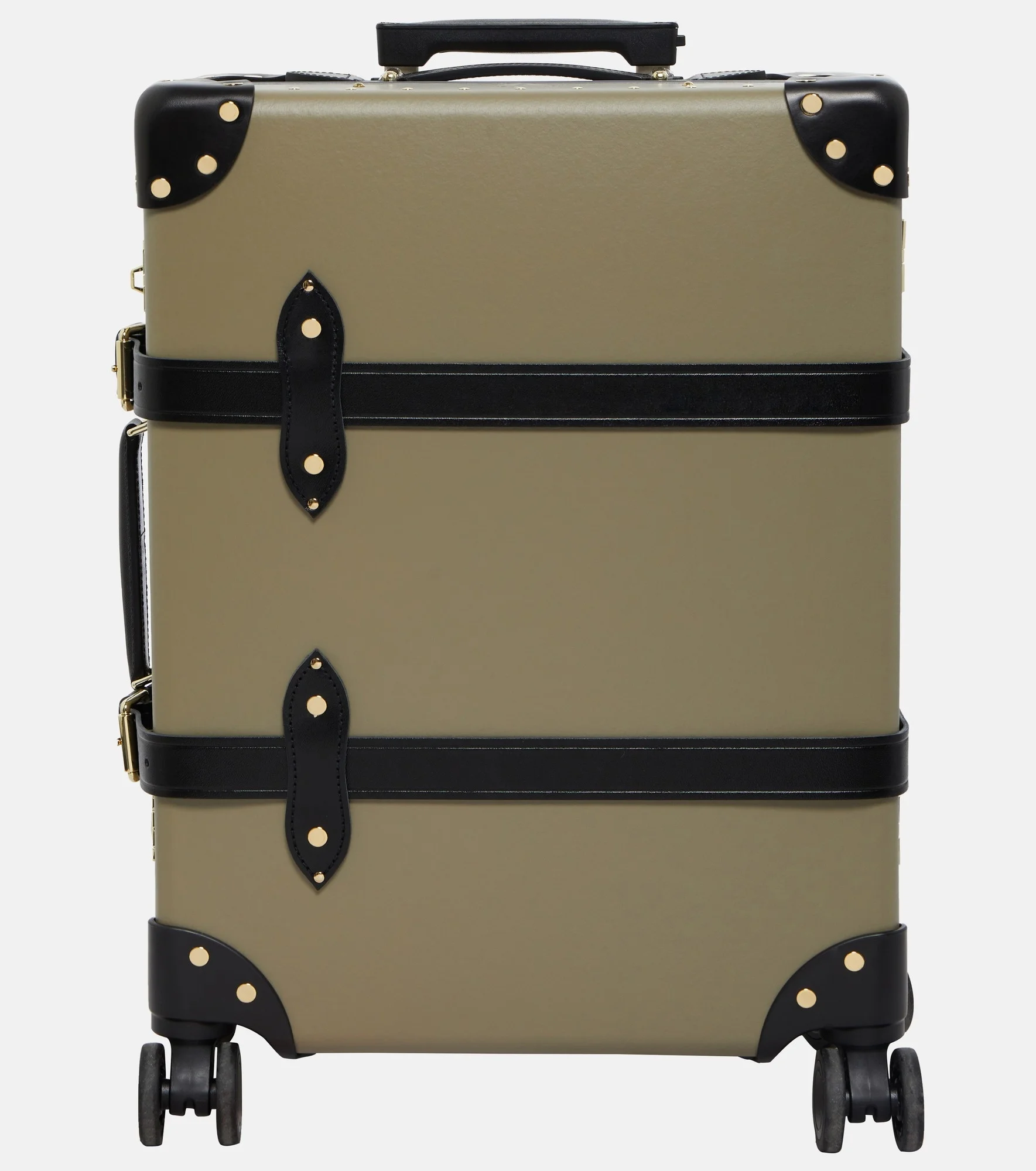 Globe-Trotter's Centenary collection commemorates a hundred years of luggage craftsmanship. This wheeled carry-on suitcase is made from patented vulcanized fiberboard and finished by hand with leather corners, straps, and handles. Product Details - Material: vulcanized fiber - Lining: fabric - Made in the UK - Closure: push-lock fastening - Top handles - Trim: leather - Item number: P00830300 Size & Fit - Height 56cm-22" - Width 42cm-16.5" - Depth 21cm-8.5"