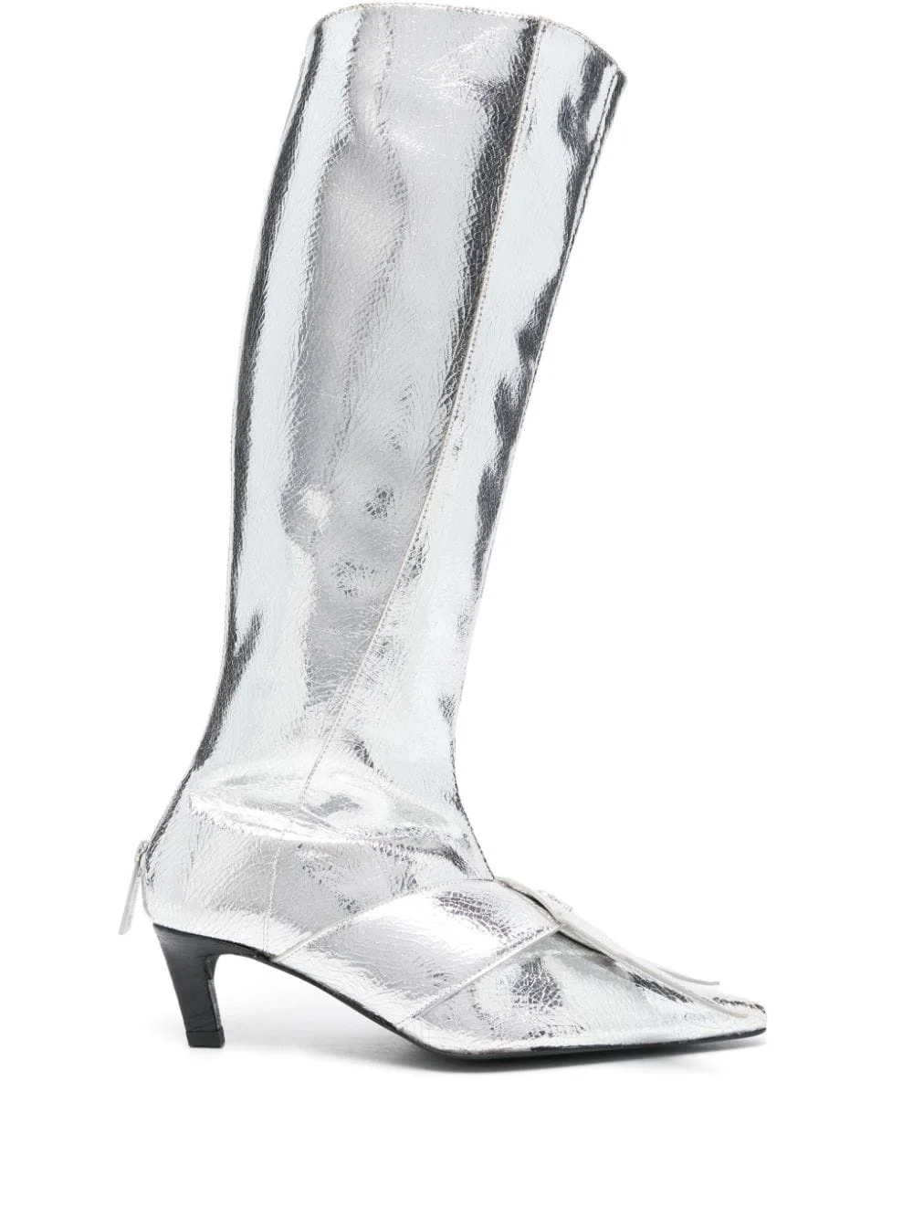 60mm Zina boots Highlights - Silver-tone - Faux leather - Lame effect - Cracked effect - Rear zip fastening - Strap detailing - Silver-tone logo plaque - Pointed toe - Branded insole - 60mm mid heel - Rubber outsole - Knee-high Imported Composition Other fibres 100% SIZE & FIT Measurement HEEL 2.36 in(6 cm) HEIGHT 15.74 in(40 cm)