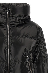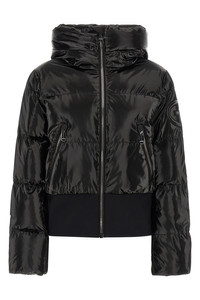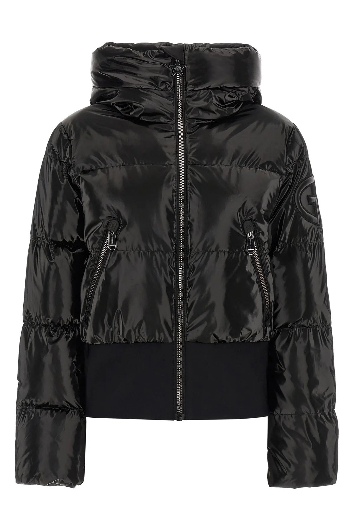 cod. GB010102549000 'Bombardino' ski jacket in water-repellent, breathable, quilted and goose feather padded technical fabric, hood, high neck, front zip closure, pockets, long sleeves with windproof gaiter and leather logo embroidery, Softshell band on the garment bottom. SUSTAINABLE: Product made with recycled materials. Color: Black Size & Fit: slim fit - FRENCH size Composition: 52% polyester, 48% polyurethane Made in: China