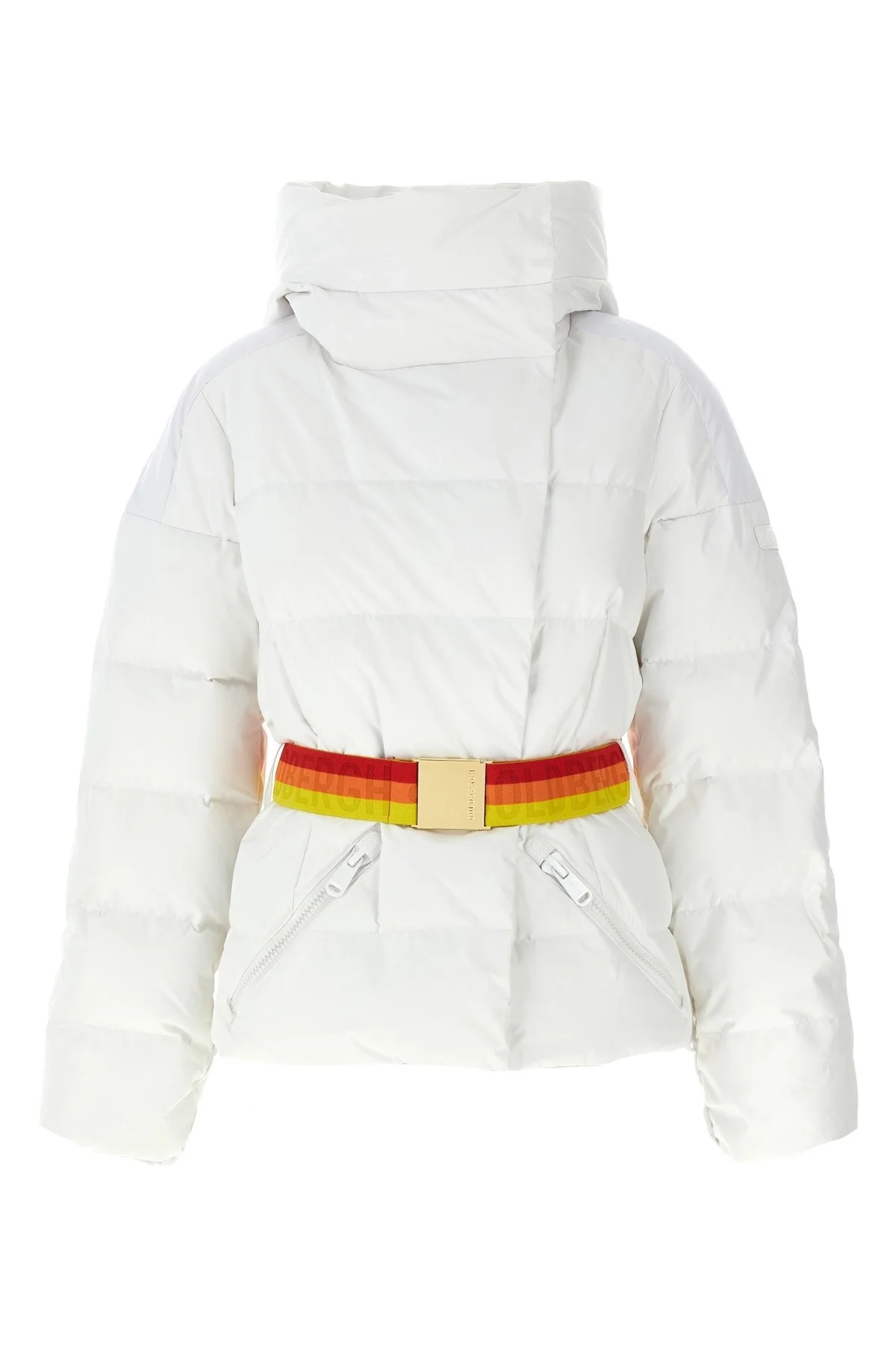 cod. GB002212548000 'Bufera' ski jacket in water-repellent, breathable, quilted and goose feather padded technical fabric, adjustable hood, high neck, front zip and snap button closure, pockets, long sleeves with windproof gaiter and tone-on-tone silicone logo patch, inner gaiter, drawstring on the hem, side zip slits, removable belt. Color: White Size & Fit: slim fit - FRENCH size Composition: 100% polyester Made in: China