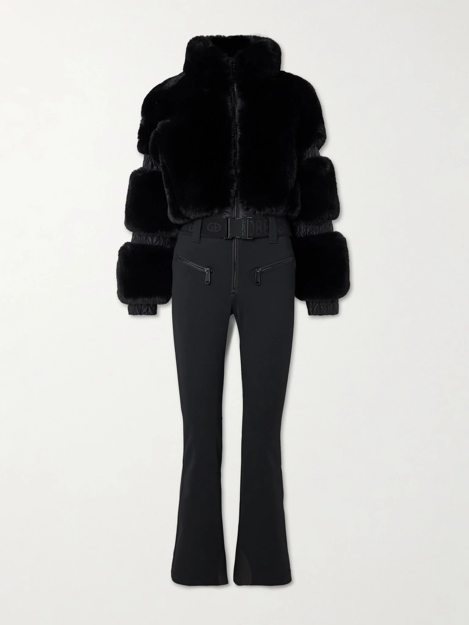 Goldbergh's ski suit finds the perfect balance of style and substance. It has a faux fur 'jacket' that resembles vintage coats and waterproof stretch-shell pants with zipped hems to fit over your boots. Designed with 'Powerstretch' technology, it won't restrict your movement and has plenty of zipped pockets for essentials like your lift pass and SPF lip balm. Size & Fit - Fits true to size, take your normal size - Designed for a close fit with slim pants, flared at the hem - Internal ankle gaiters with silicone grips for a secure fit - Heavy-duty, slightly stretchy fabric - Model is 180cm/ 5’11” and is wearing a UK 8 Model measurements: - Bust: 78cm/ 31" - Waist: 65cm/ 25.5" - Hip: 90cm/ 35.5” Details & Care - Black faux fur and stretch-shell - Zip fastening along front - Fabric1: 74% polyamide, 26% elastane; fabric2: 100% polyester; fabric3: 100% recycled polyester; lining1: 58% polyester, 42% recycled polyester; lining2: 100% polyamide - Machine wash