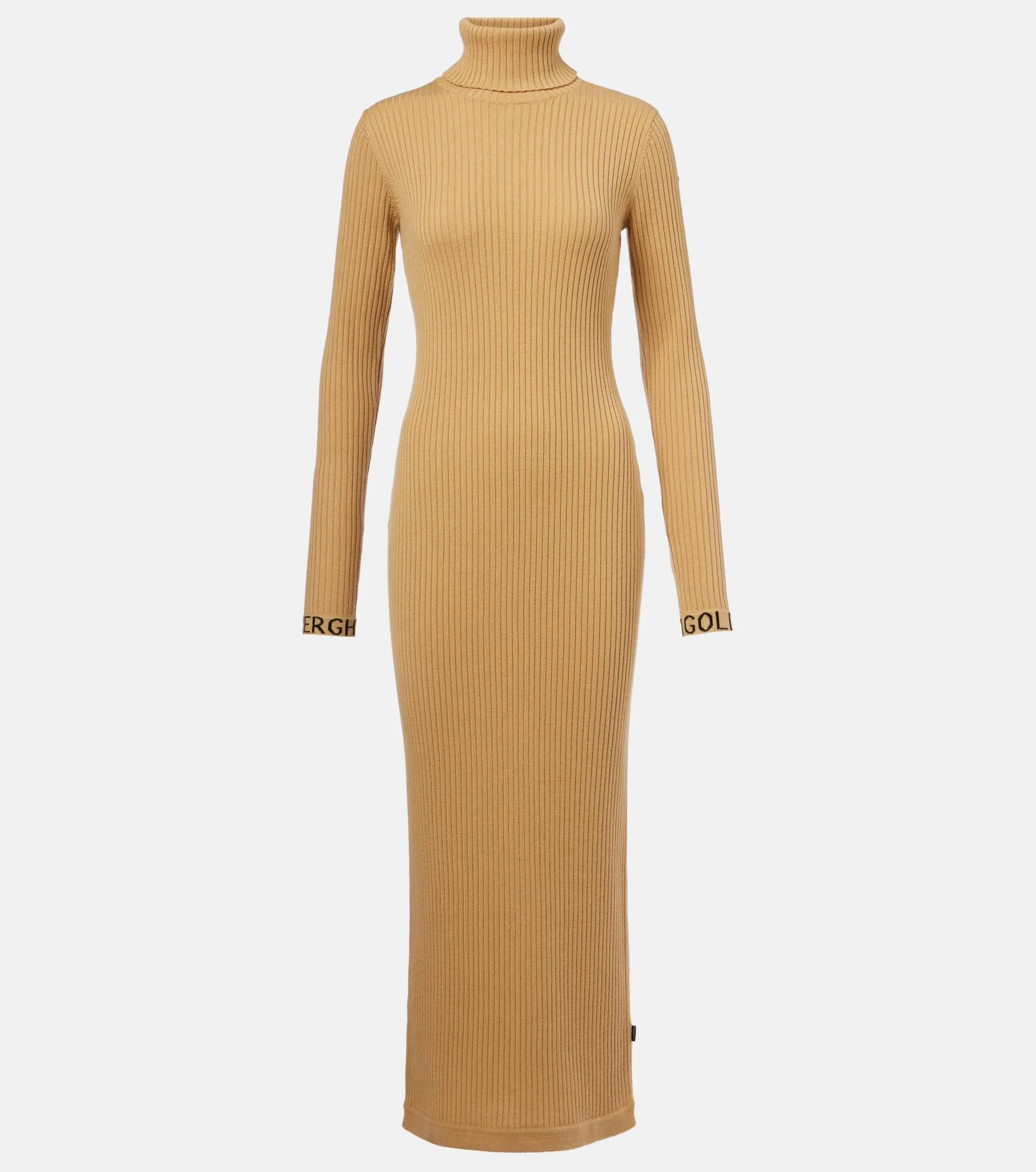 The Mireille maxi dress from Goldbergh features a finely ribbed-knit construction, complete with contrasting jacquard logo lettering on the cuffs. This turtleneck silhouette is adorned with a tonal metal anagram tag on the left shoulder. Product Details - Material: 45% acrylic, 30% wool (merino wool), 25% nylon - Care instructions: specialist clean - Made in China - Designer color name: Caramello - Item color: beige - Slim fit - Collar: turtleneck - Sleeves: long-sleeved - Item number: P01064210 Size & Fit - True to size - Fitted - Stretchy fabric - The model seen in the picture is 178cm-5'10" and wearing a size XS