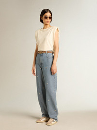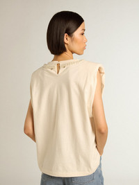 From Venice, our home, to Paris, our dream. This Journey Collection captures the essence and beauty of everyday moments in the City of Lights, immersed in a mesmerizing atmosphere where intimacy, authenticity and curiosity are the pulsating soul of it. In aged white cotton, this sleeveless T-shirt features pearls of different sizes embroidered in the shape of a necklace. The padded shoulders add the final touch, giving this piece a unique shape. DETAILS Item No. GWP01789.P001421.11560 - Journey Collection - Color: aged white - Double star on the back - Embroidered pearl necklace - Sleeveless style - Regular fit - Padded shoulders - Main material: 100% cotton - Made in Italy The model is 177 cm tall and is wearing a size S.