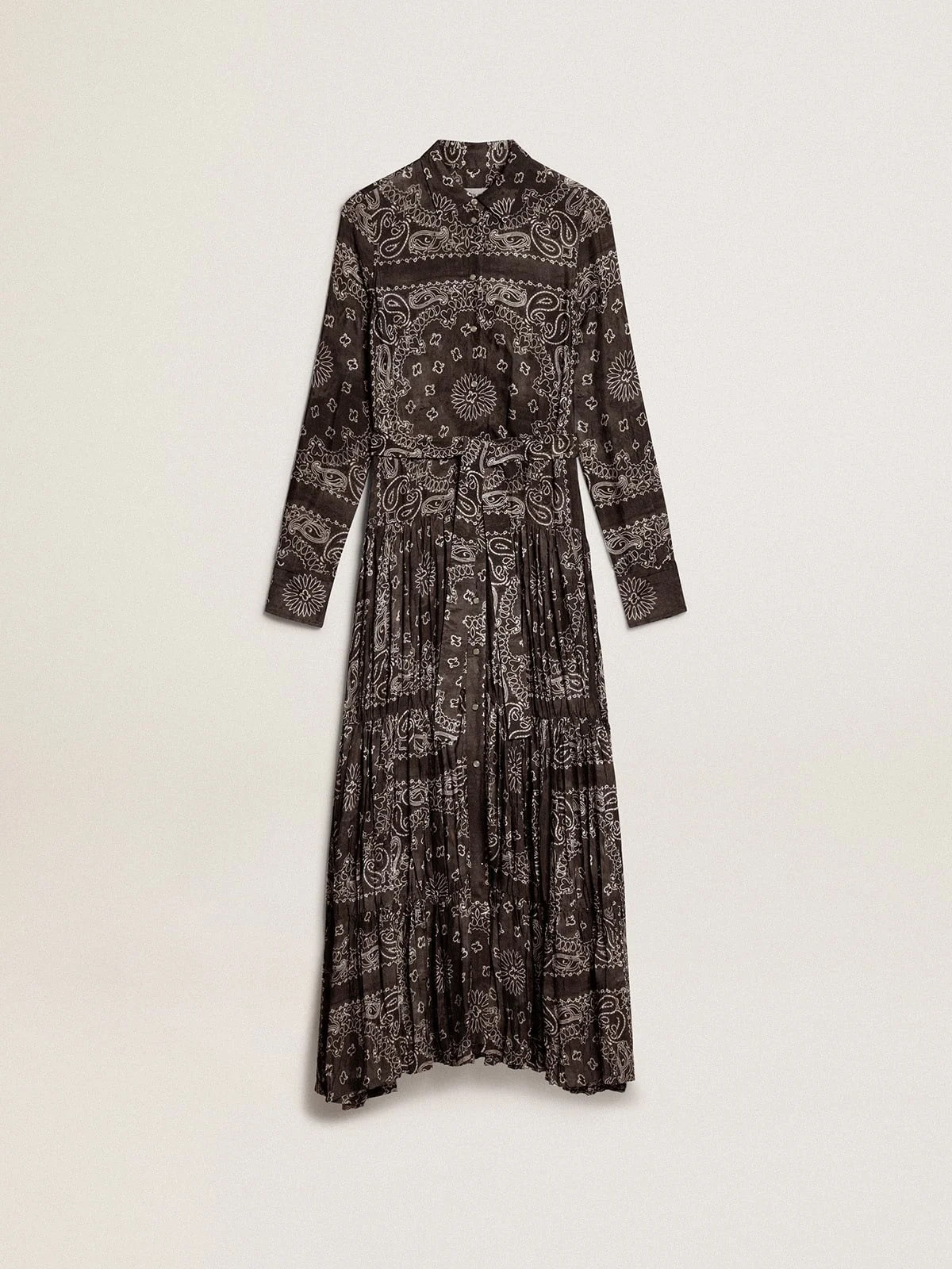 A unique, timeless collection that encapsulates the Golden Goose DNA, designed to remain with you every day, through thick and thin, come rain or shine. This anthracite-gray shirt dress in fluid viscose features a paisley print and a tone-on-tone belt at the waist. The detachable white patch with a finely embroidered letter G in red adds the finishing touch. DETAILS Item No. GWP00824.P001257.60318 - Golden Collection - Color: anthracite gray - Paisley print - Tone-on-tone belt at the waist - Double gold star at the back - Detachable white patch with embroidered red letter G - Long sleeves - Side slits - Mother-of-pearl button fastening - Main material: 100% viscose - Made in Italy The model is 177 cm tall and is wearing a size S.