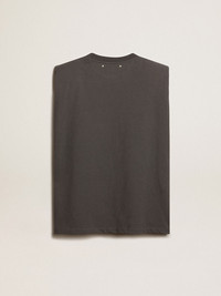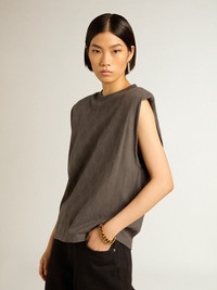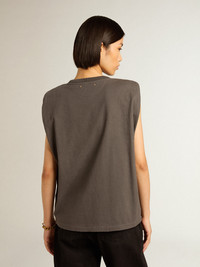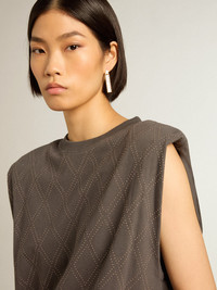 From Venice, our home, to Paris, our dream. This Journey Collection captures the essence and beauty of everyday moments in the City of Lights, immersed in a mesmerizing atmosphere where intimacy, authenticity and curiosity are the pulsating soul of it. This relaxed-fit sleeveless T-shirt in anthracite gray teaseled cotton jersey features a diamond pattern on the front decorated with silver studs. DETAILS Item No. GWP01449.P001446.60318 - Journey Collection - Color: anthracite gray - Double star on the back - Diamond pattern with silver metal studs - Shoulders lined in light cotton jersey - Relaxed fit - Main material: 100% cotton - Rib material: 100% cotton - Made in Italy The model is 177 cm tall and is wearing a size S.