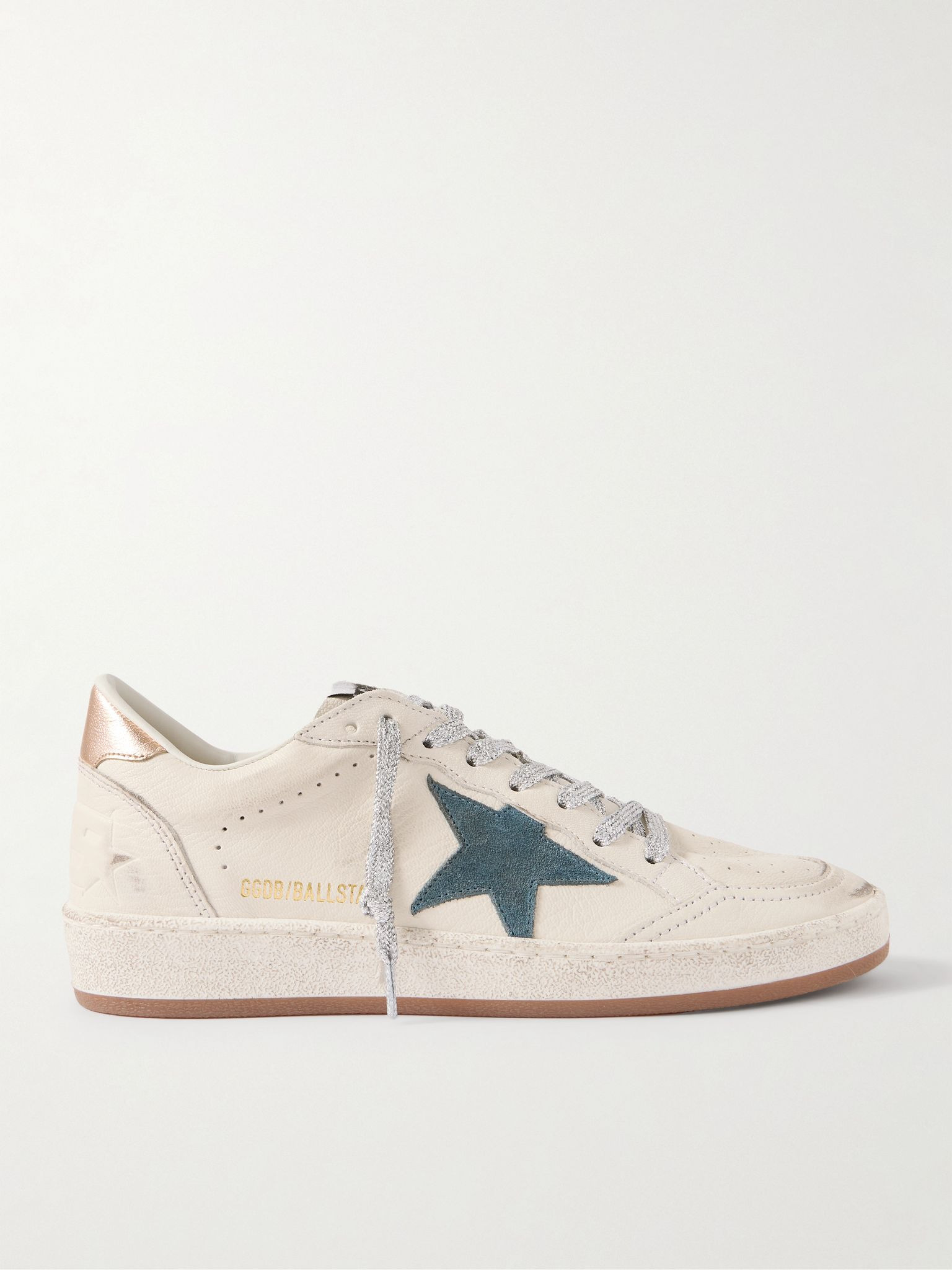 Crafted in Golden Goose's Italian atelier, these 'Ball Star' sneakers emphasize the brand's best-loved signatures. They're made from supple, hand-distressed leather trimmed with contrasting suede stars and have comfortable rubber soles. Note the shimmering rose-gold heel tabs and metallic laces. Details & Care - Rubber sole measures approximately 30mm/ 1 inch - Cream and rose-gold leather, navy suede - Lace-up front