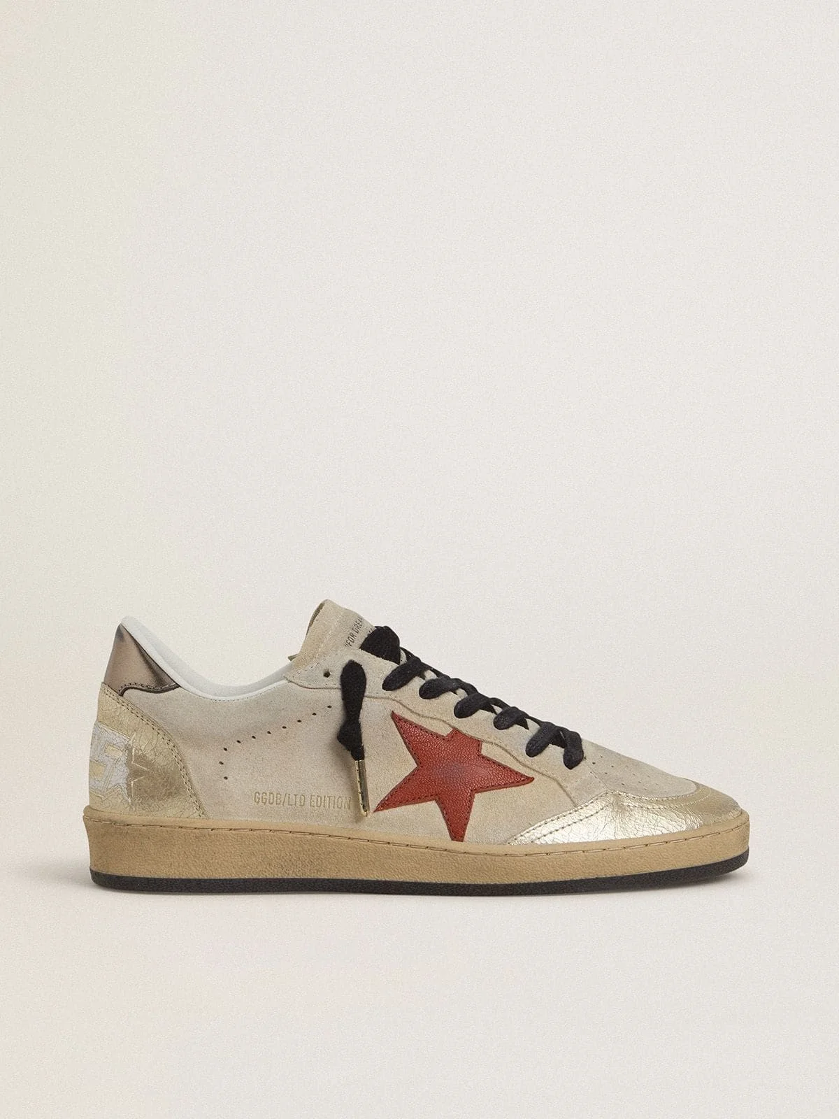 Dreaming of the Eighties. Our Ball Star sneakers have an American college vibe caught between a hoop shot and a skateboard ride. Like this model crafted in beige suede with platinum-colored foiled leather inserts, featuring a red leather star and metallic bronze-colored foiled leather heel tab. The black laces and the Sneakers writing on the heel in a white "heavy metal" font add the finishing touch: beautiful things that never go out of fashion. DETAILS Item No. GWF00117.F007318.15764 - Beige suede upper - Red leather star - Metallic bronze foiled leather heel tab - Platinum foiled leather inserts - Sneakers lettering on the heel in a white heavy metal font - Black laces - Vintage finish - Upper: 97% cow leather, 3% sheepskin leather - Lining: 34% cotton, 31% cow leather, 24% textile polyurethane, 7% viscose, 4% polyester - Sole: 100% rubber - Handmade - Made in Italy